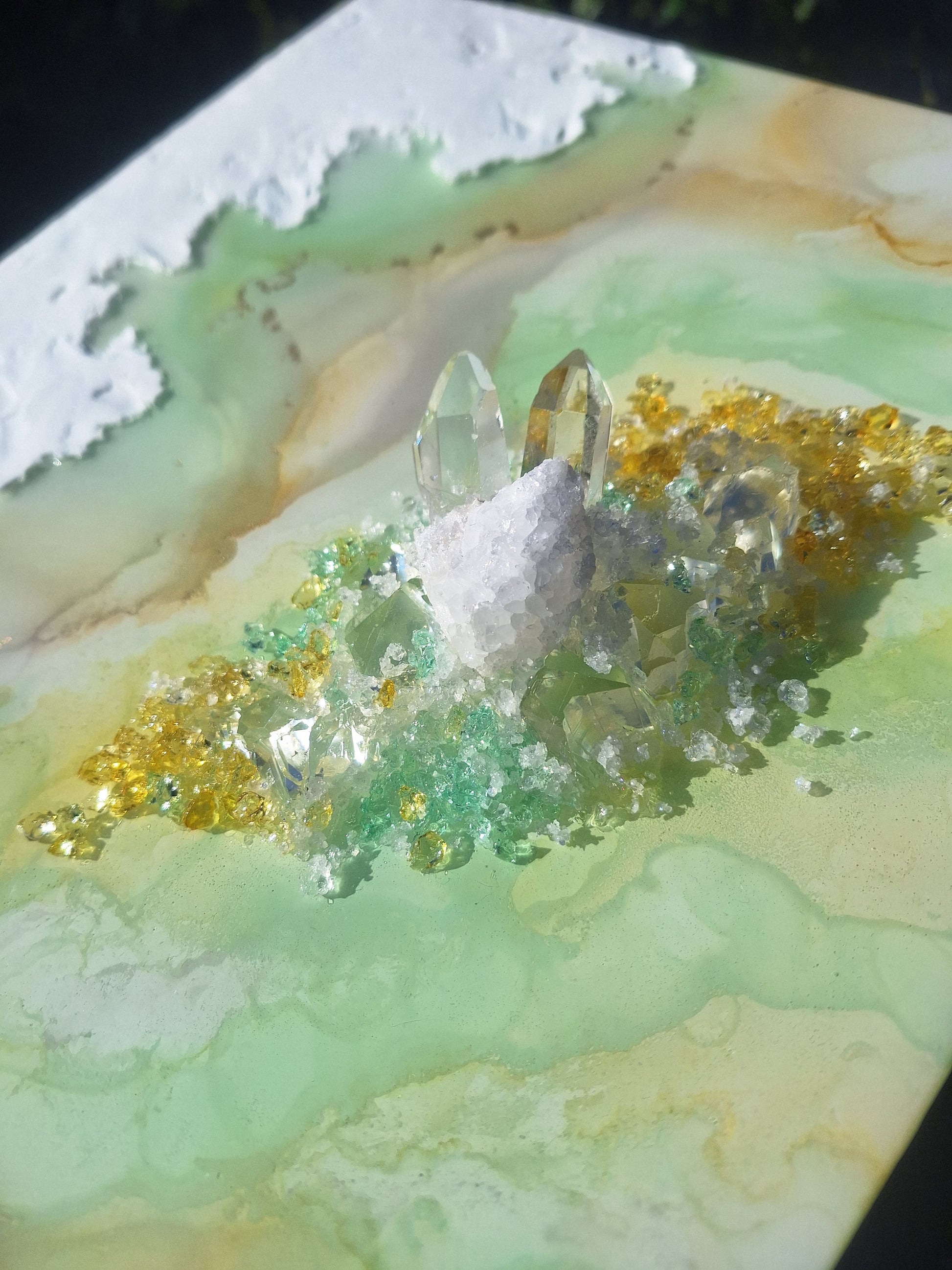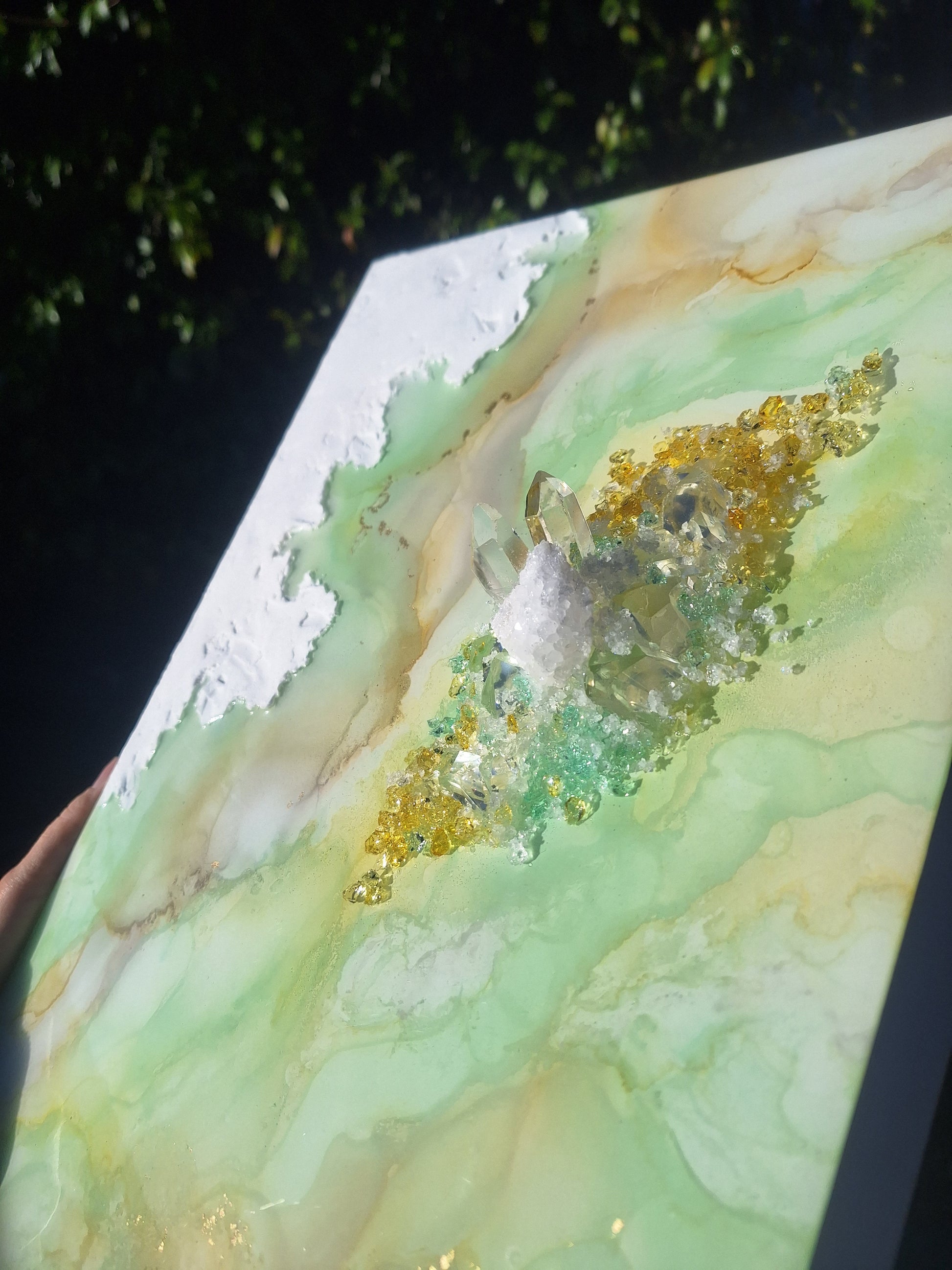 At the heart of this artwork lies a radiant clear quartz crystal, symbolizing clarity and healing, surrounded by delicate druzies that mirror the gentle tones of the painting. These exquisite elements draw the eye, sparkling with an otherworldly light that brings the entire piece to life. Finished with a high-gloss resin, Awakening Harmony radiates a luminous sheen that captures and reflects light, enhancing the vibrant colors and textures while creating a mesmerizing visual depth.