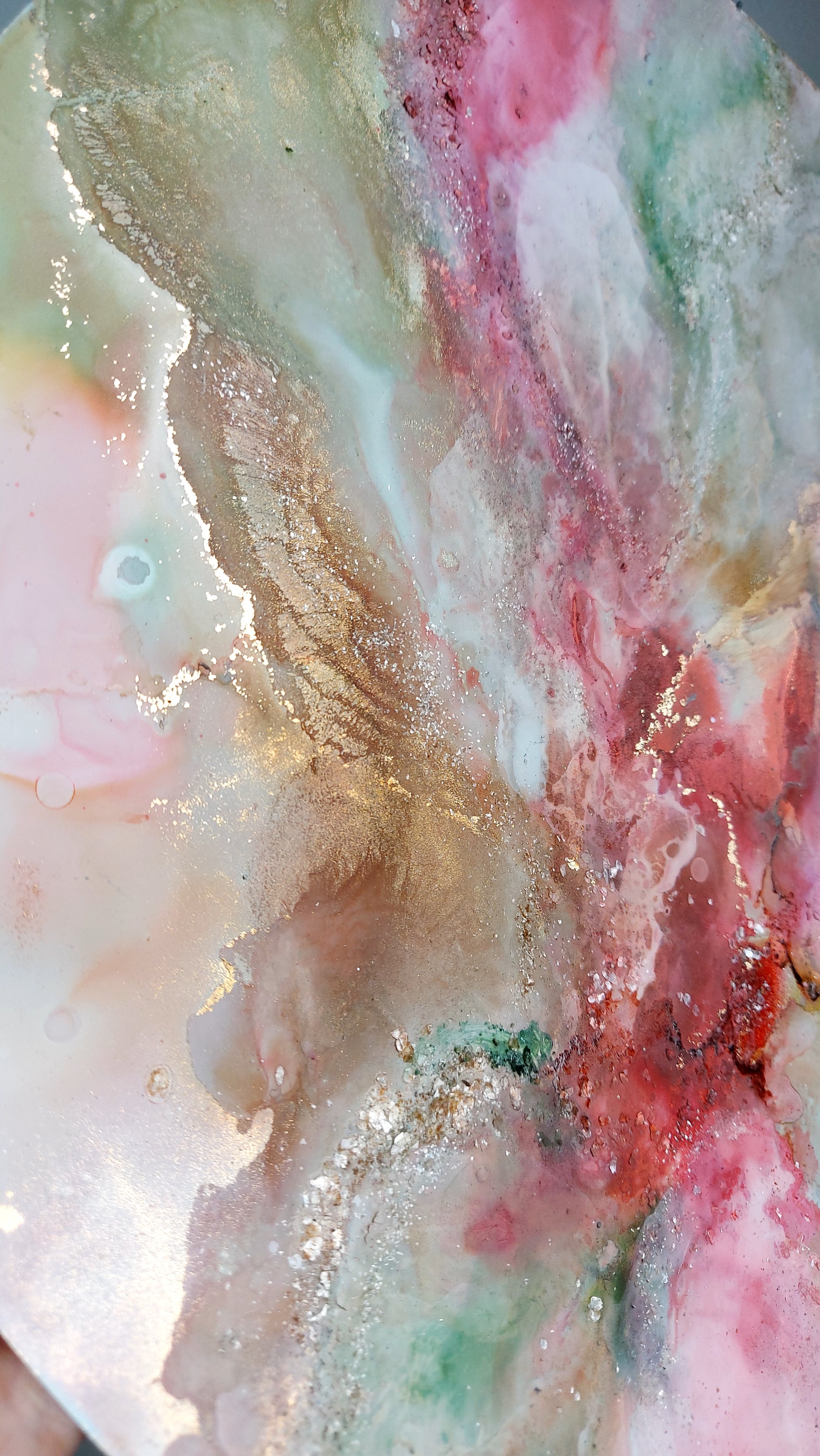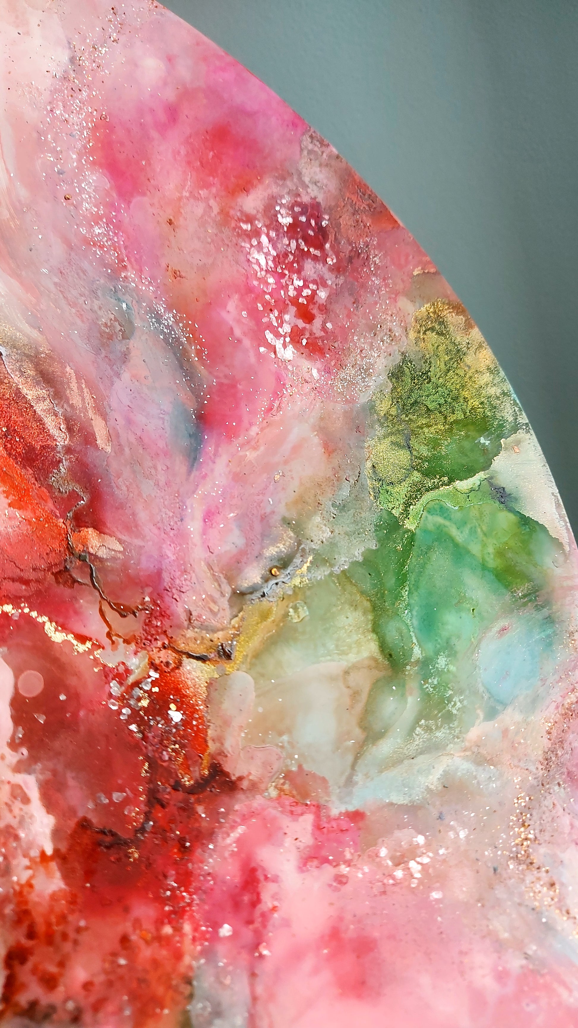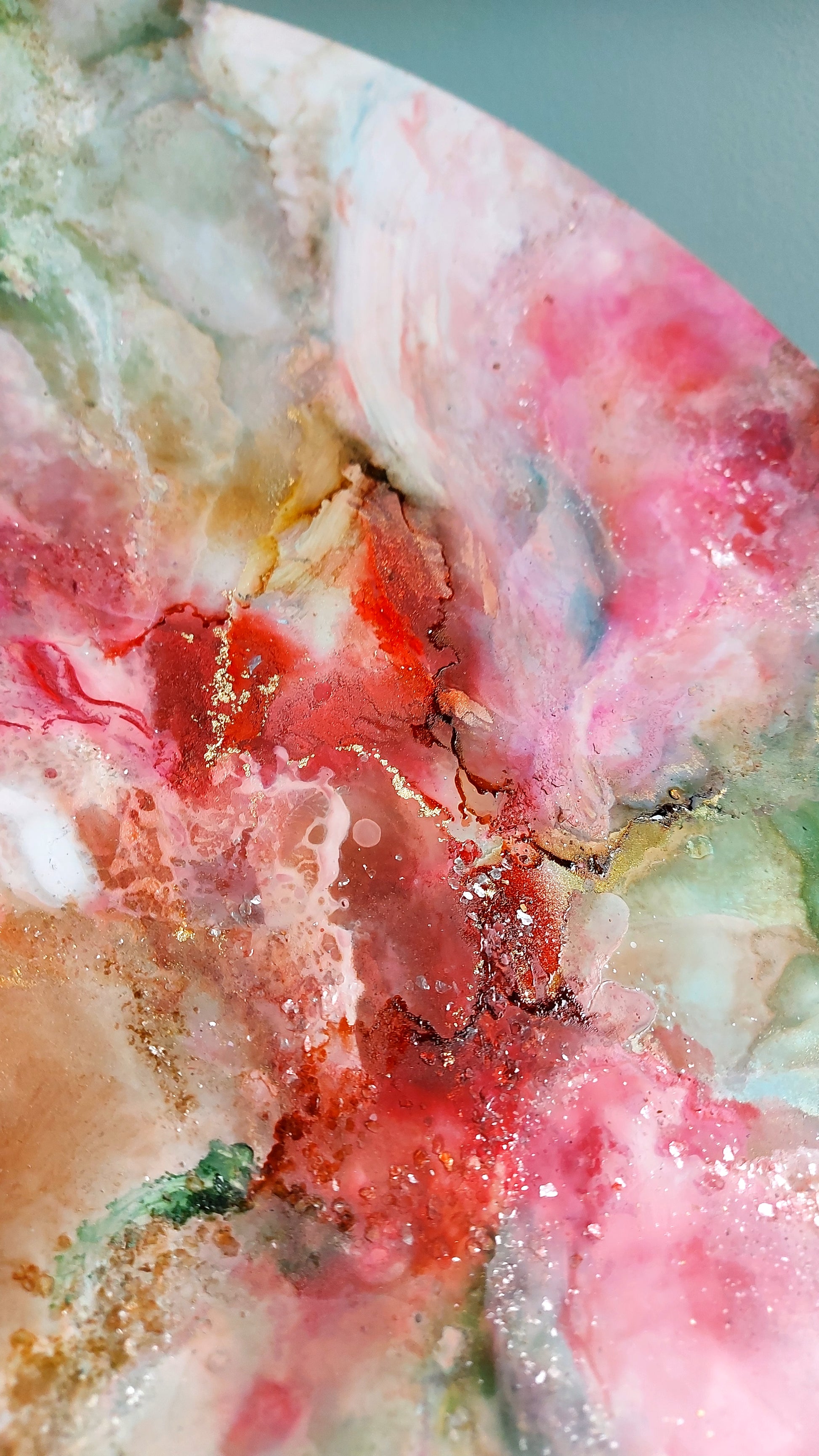 The shimmering mica flakes catch the light as you move past, transforming the painting with each shift in perspective. It’s as though the piece itself is alive, mirroring the dynamic and ever-evolving journey of your own growth. The sparkle isn’t just a surface detail—it’s a reflection of the hope, vitality, and balance that we strive to cultivate within ourselves. This artwork invites you to pause and contemplate your own path of healing, reminding you that just like these blossoms, your growth is beautiful, steady, and full of promise.