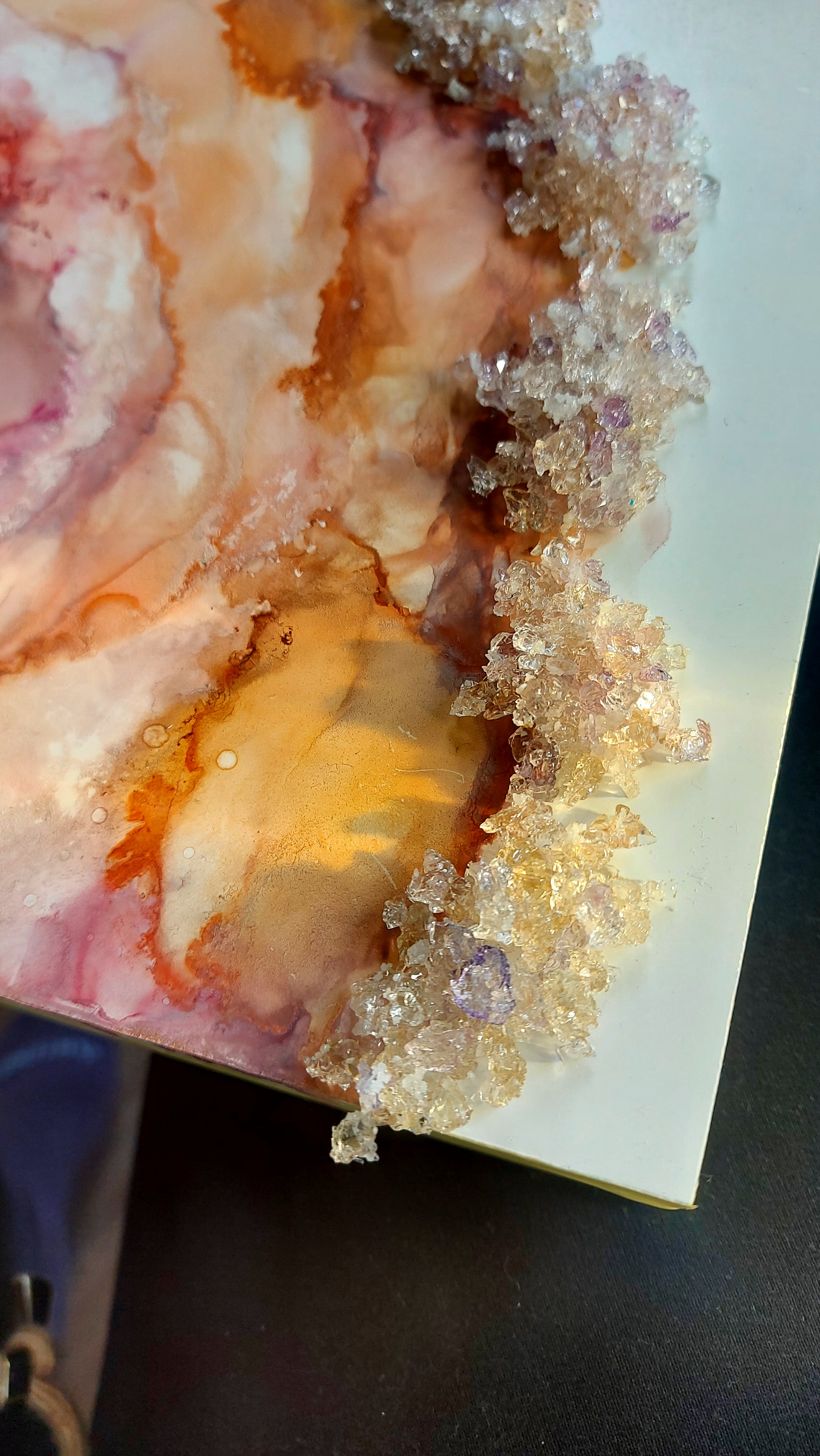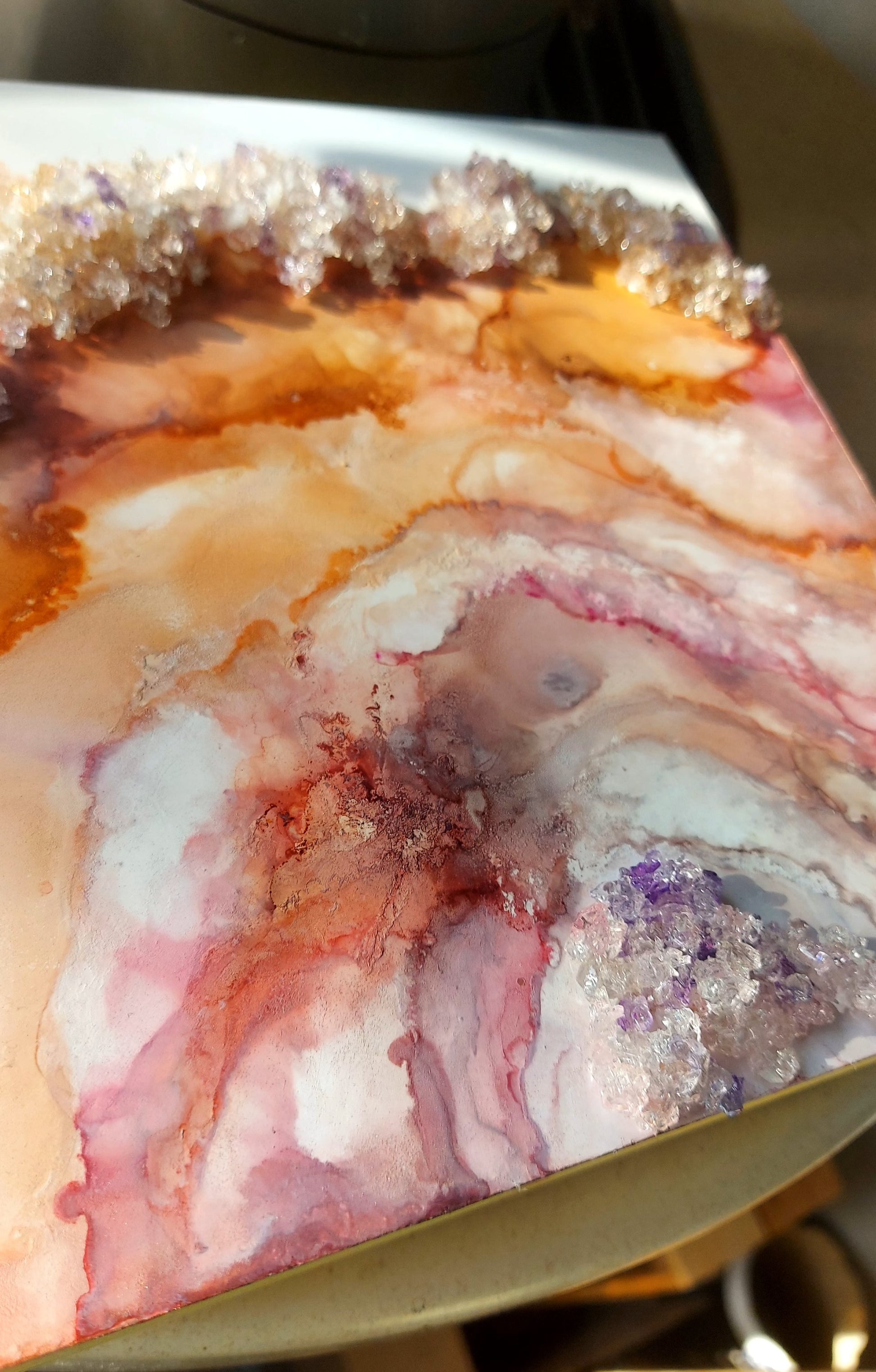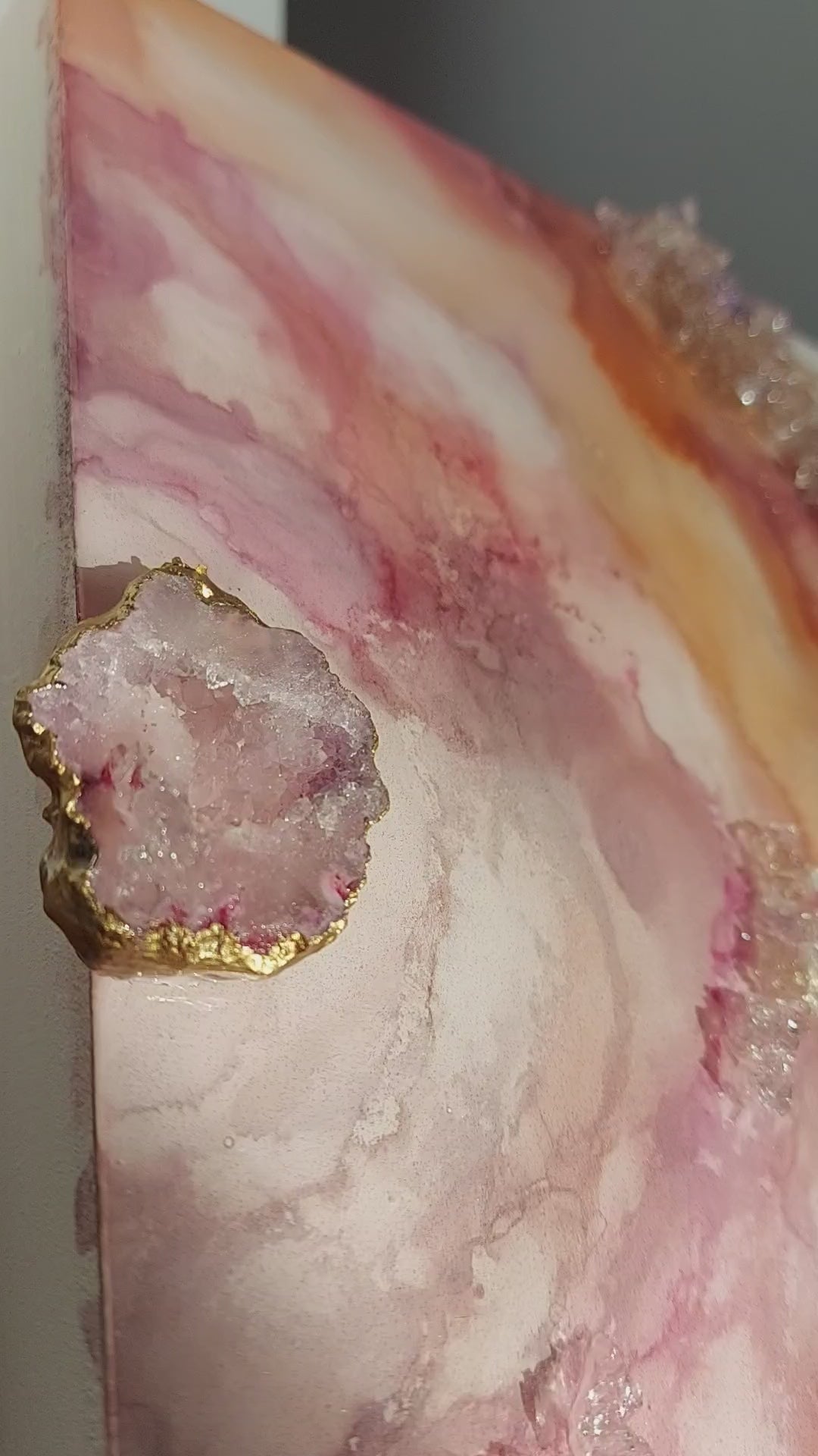 Dive into the enchanting realm of warm rose hues geode wall art with this online class, showcasing a natural aesthetic reminiscent of pink amethyst slice and a distinctive alcohol ink design. Whether you're an aspiring artist or a seasoned creator, this class is meticulously crafted to inspire and guide you in crafting unique and delicate wall art adorned with beautiful druzy, and captivating sparkle.