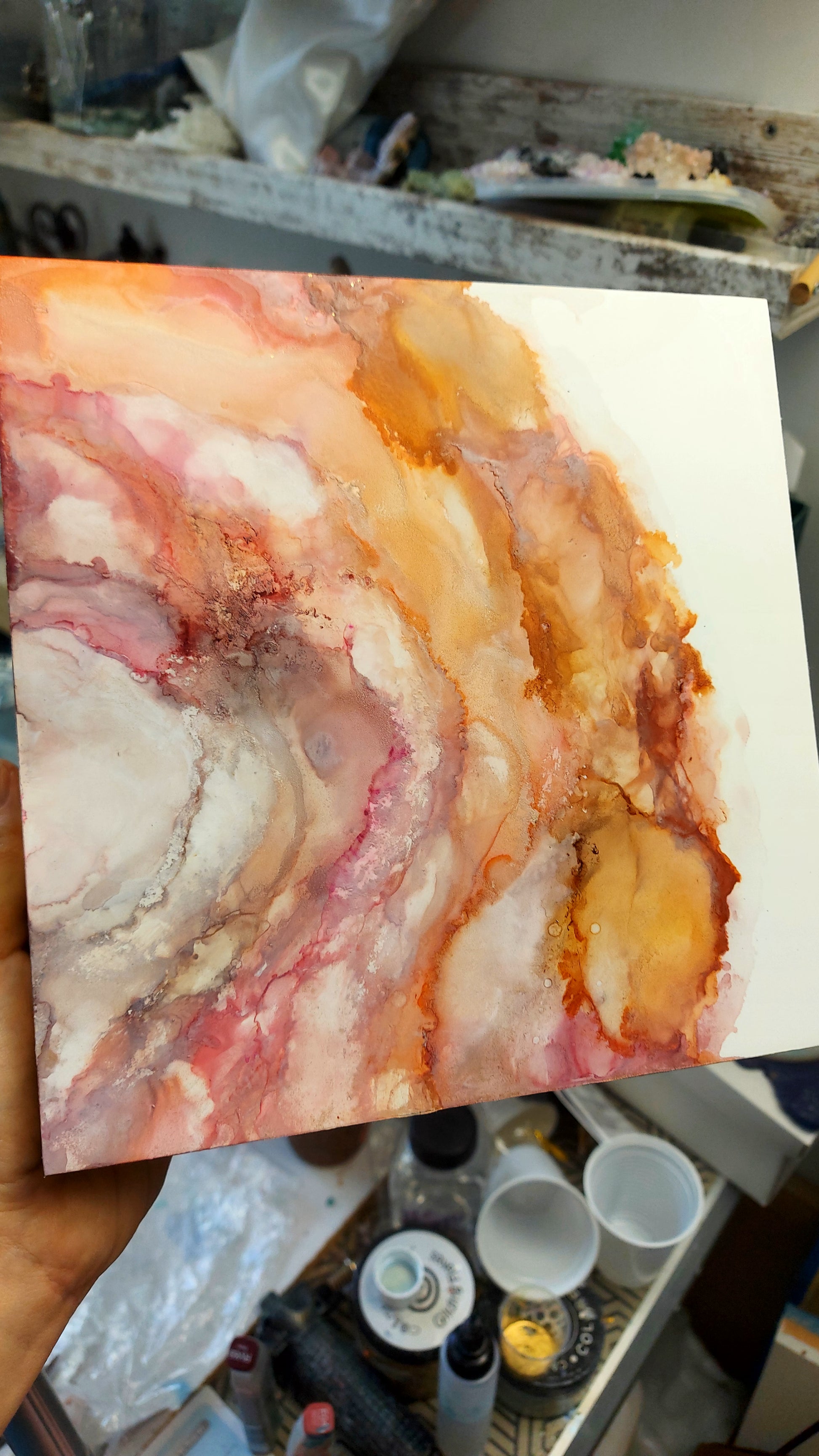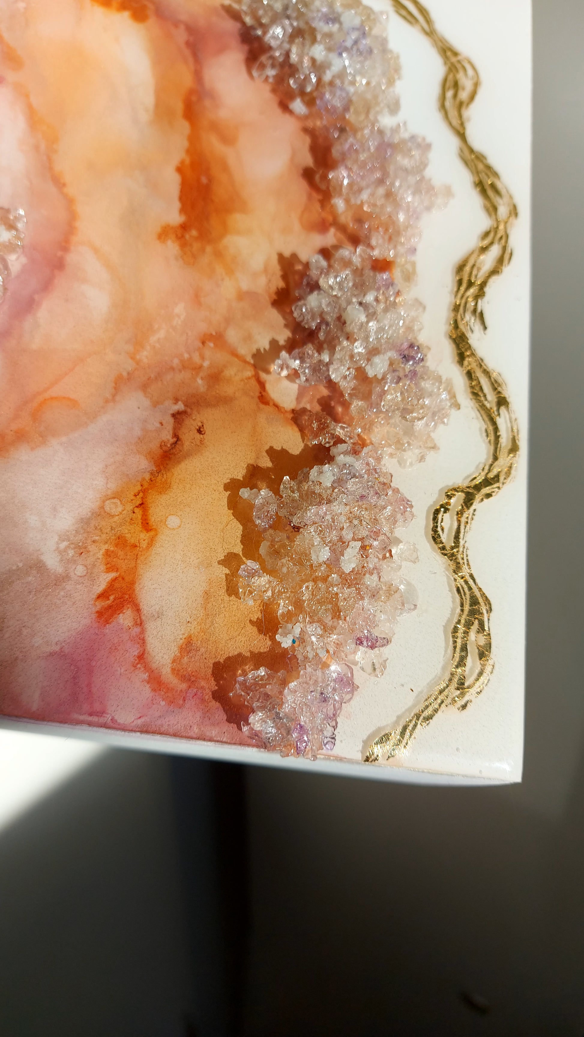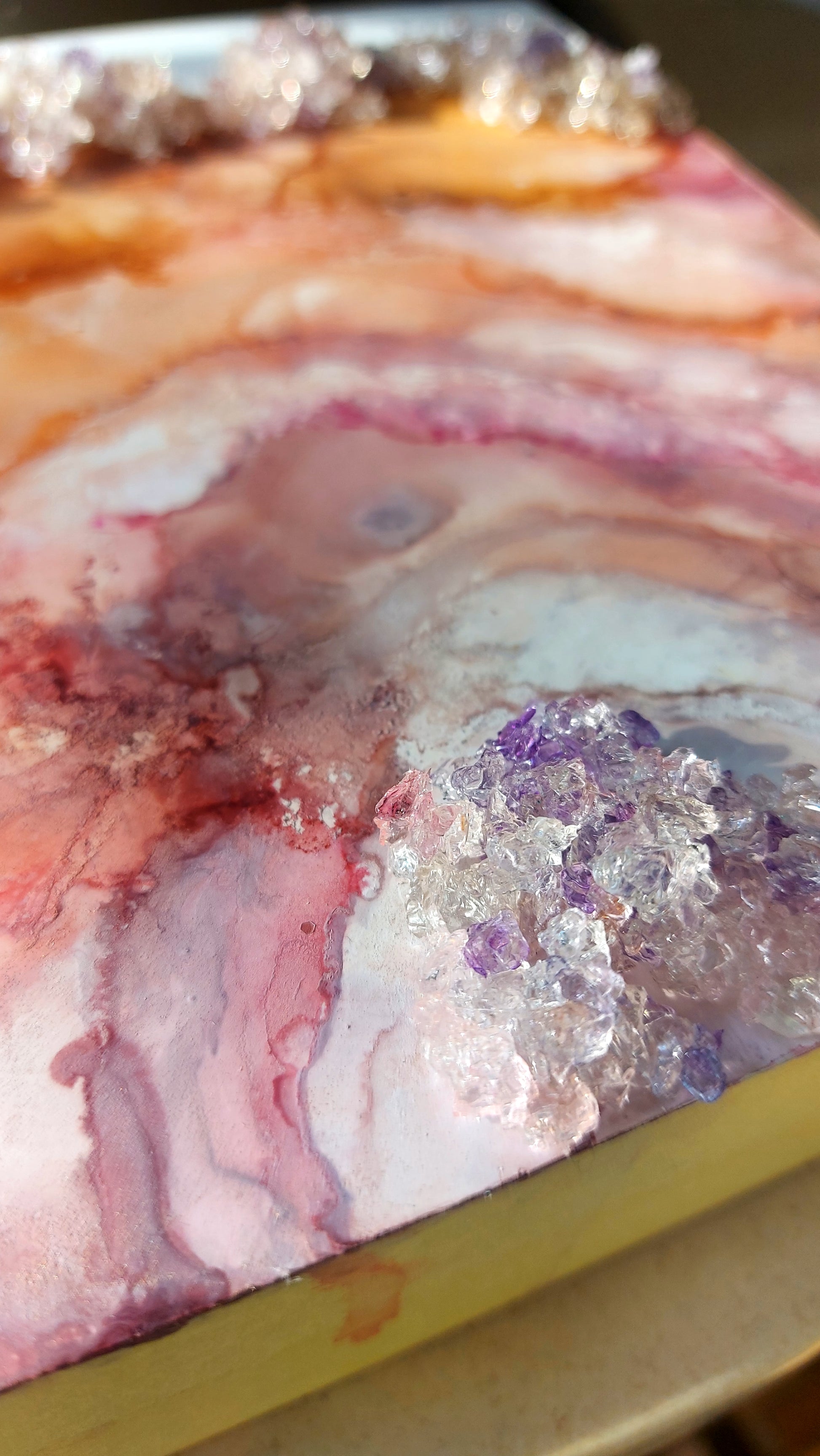 Dive into the enchanting realm of warm rose hues geode wall art with this online class, showcasing a natural aesthetic reminiscent of pink amethyst slice and a distinctive alcohol ink design. Whether you're an aspiring artist or a seasoned creator, this class is meticulously crafted to inspire and guide you in crafting unique and delicate wall art adorned with beautiful druzy, and captivating sparkle.