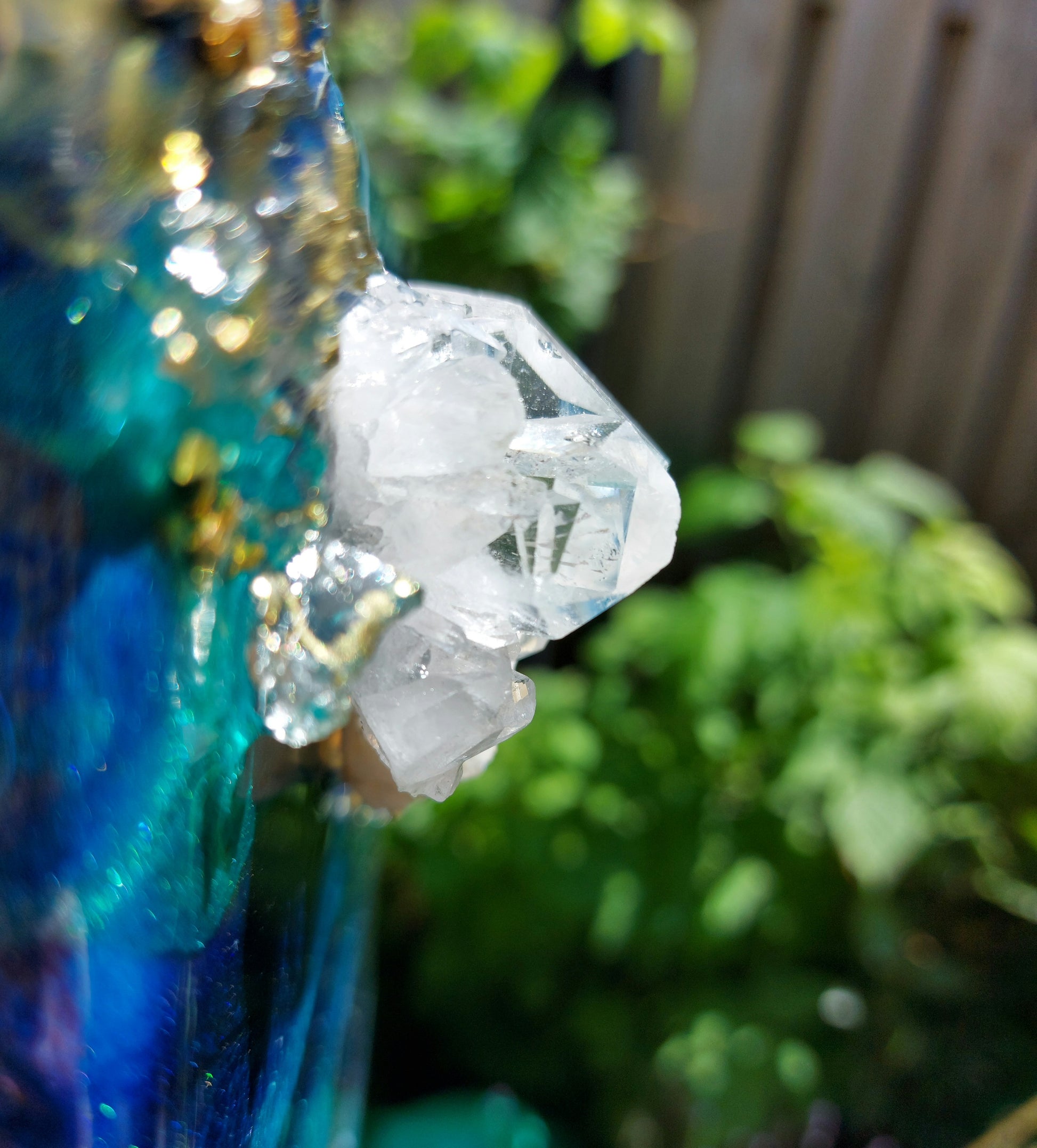 In spite of its small size, this gorgeous piece stands out with its stunning colors inspired by ocean and crystals. Depending on your preference, it can be hung, mounted on an easel or even set on a shelf or tabletop. A clean finished edge painted in gold brings a beautiful high-end finish.