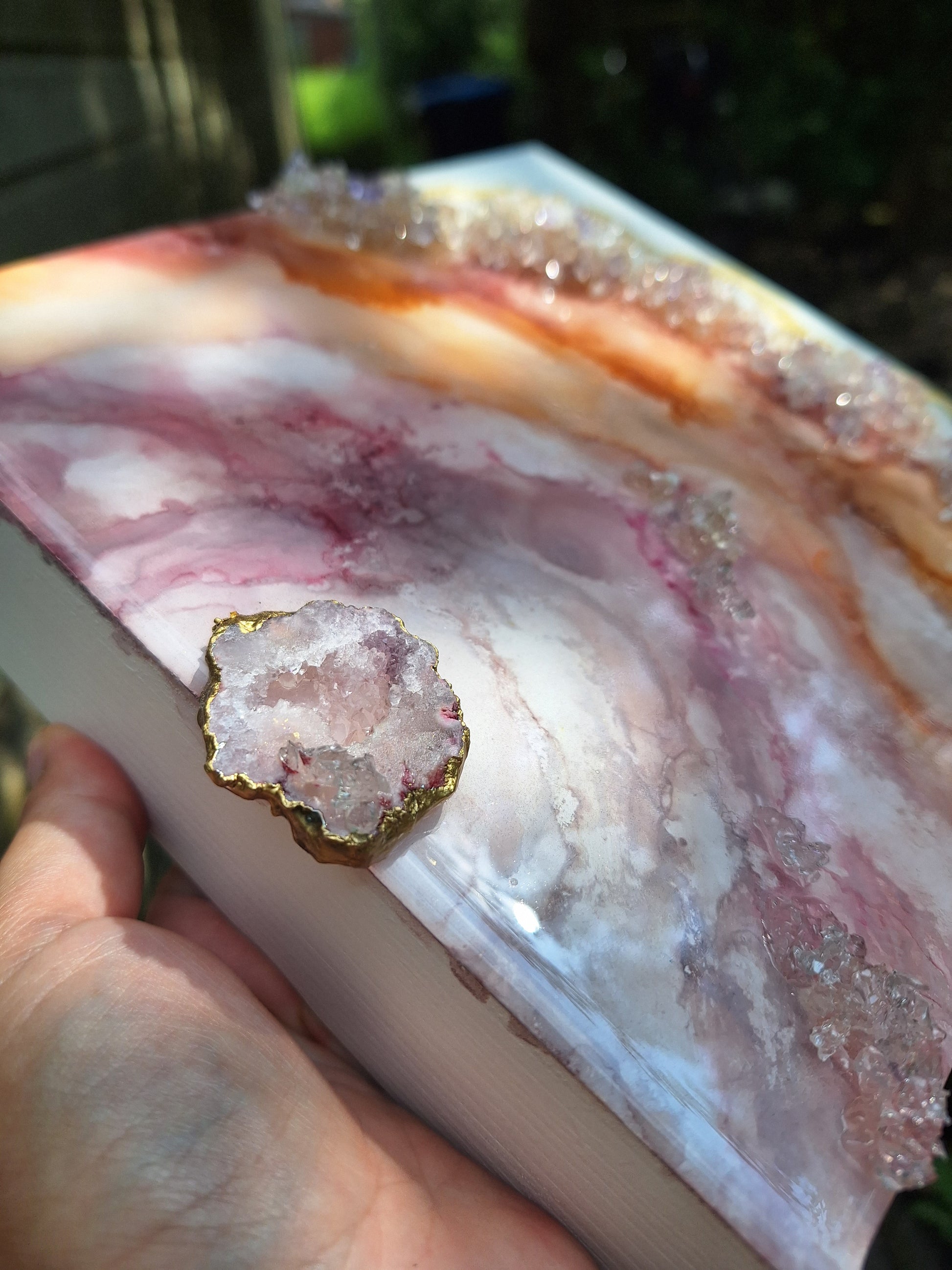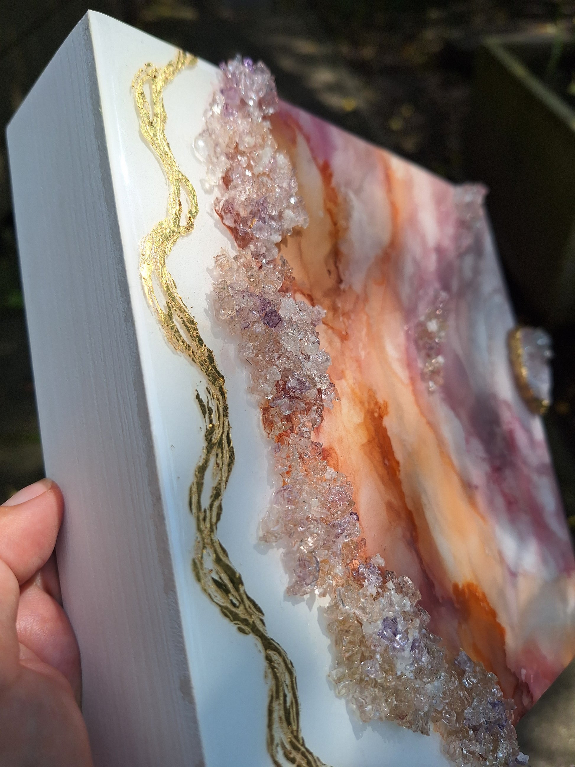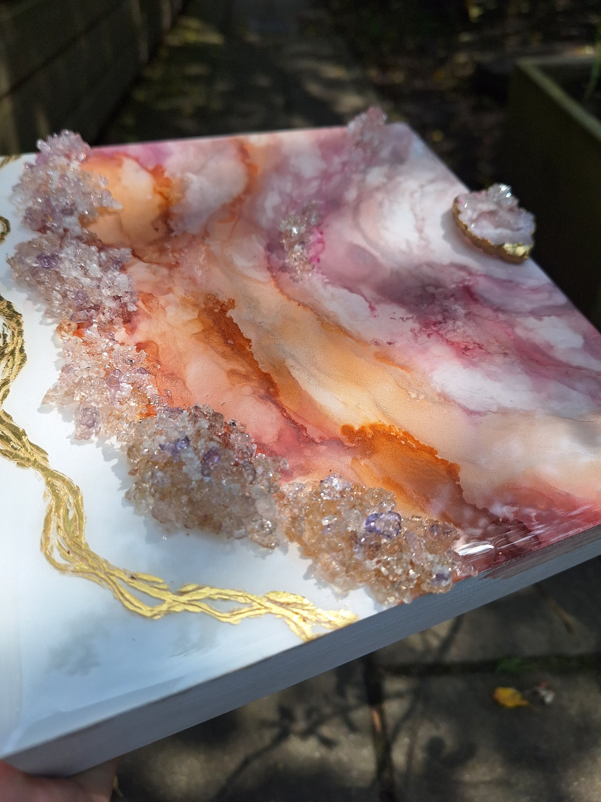 Mixed media geode painting finished with resin with crystal and druzy. Size: 20 x 20 x 5 cm ( 8 x 8 x 2 inch)