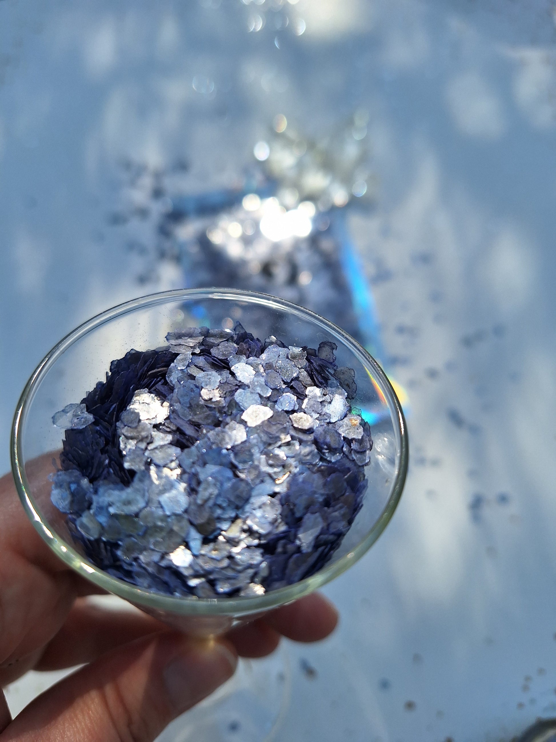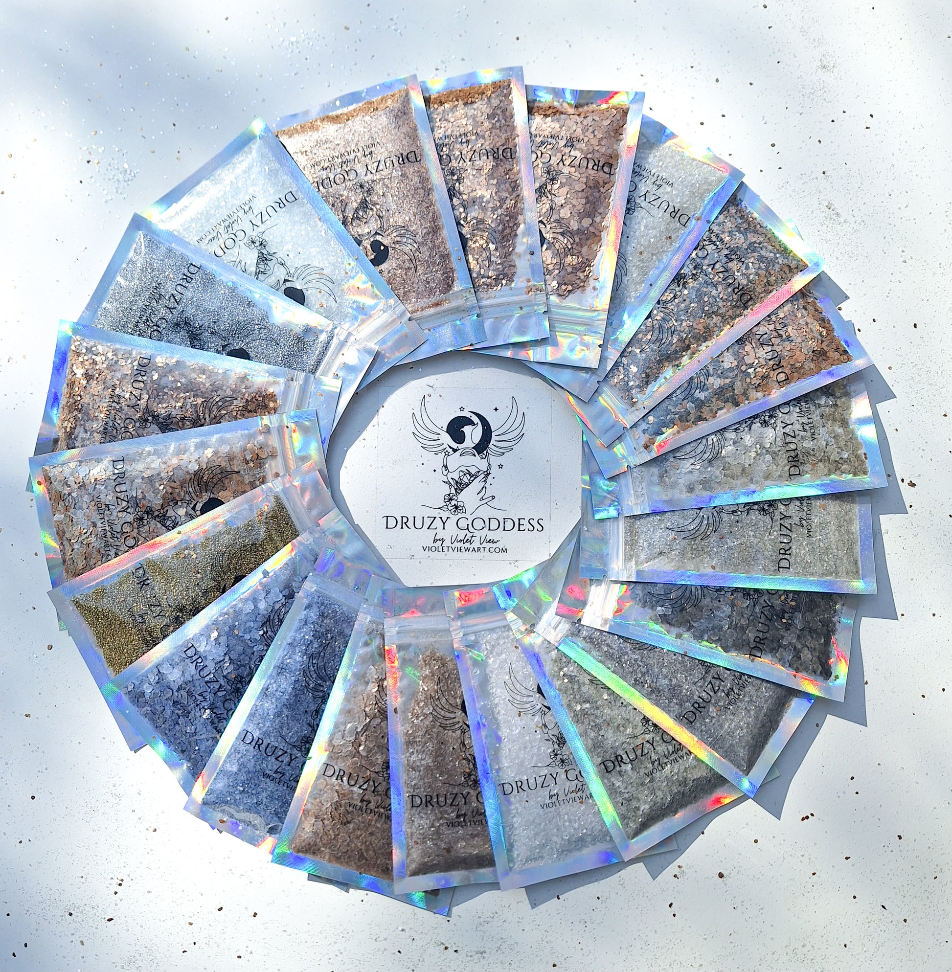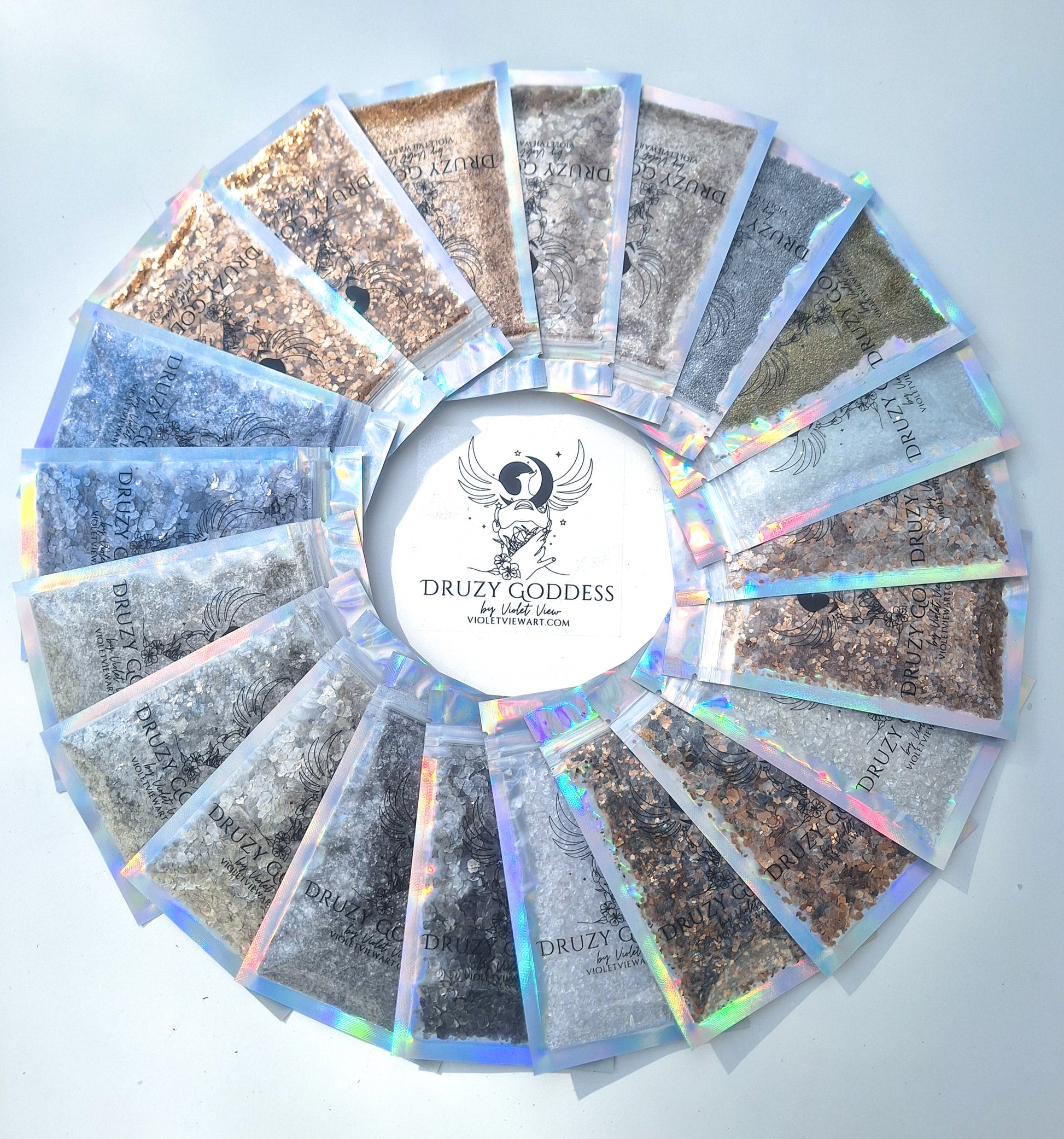 Includes a dreamy variety of fine (0.2mm), chunky (0.1–3mm), and extra chunky (1–6mm) flakes.