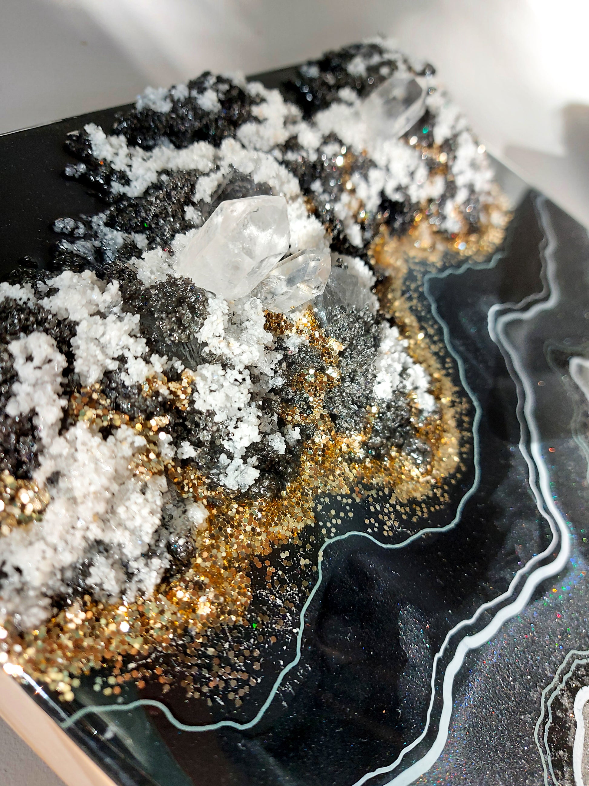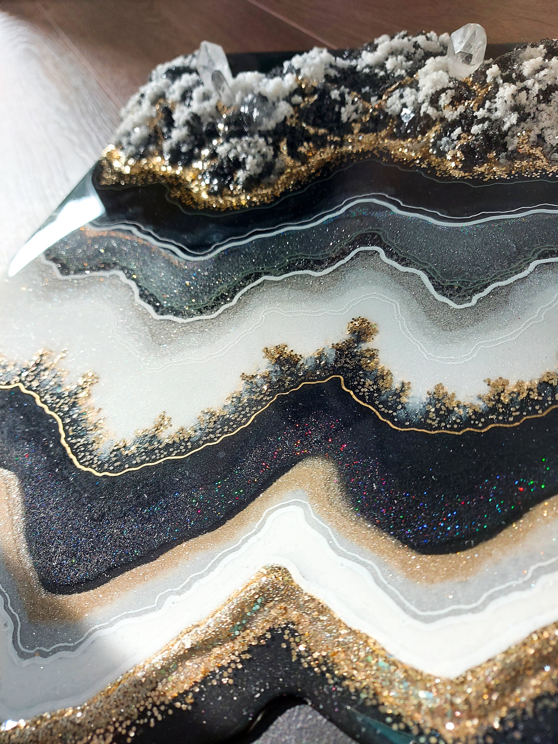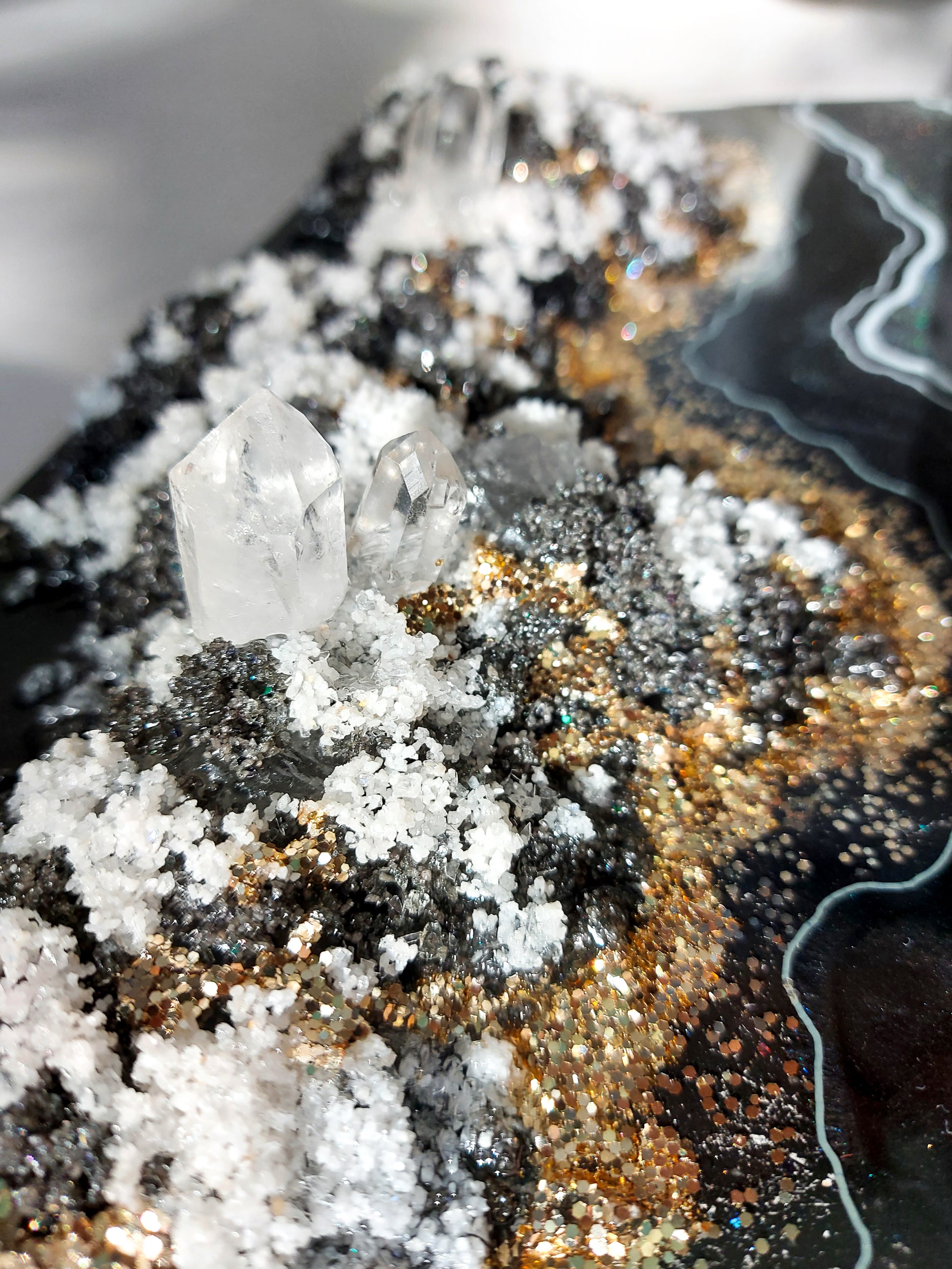 Materials used: high-quality resin and pigments, glitter, clear quartz, glass and sand on the 2 cm thick professional art wooden panels.