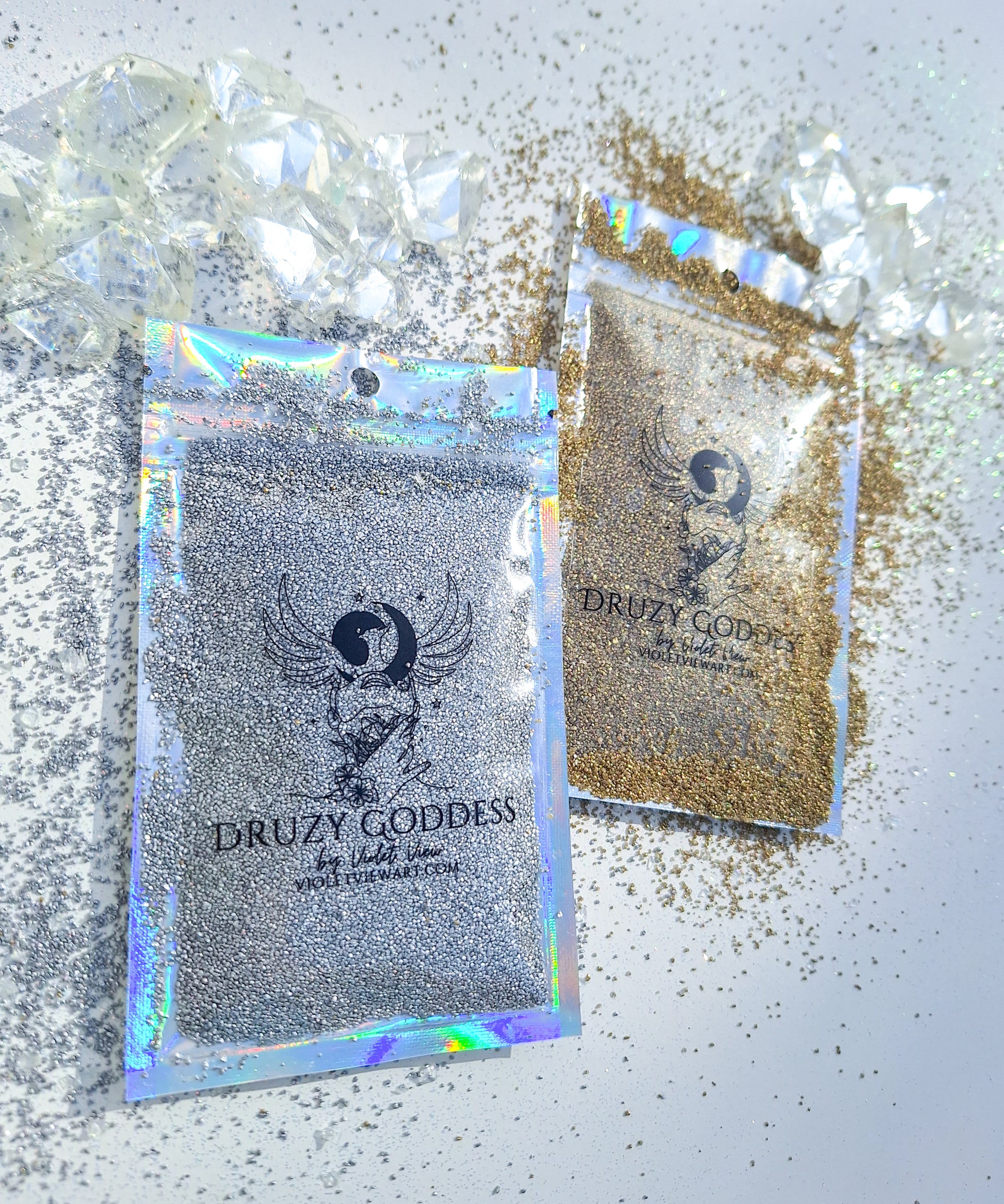 3 x glitters on the photo and video are discontinued. As a replacement you get other druzy products like Theia's gold, silver, and druzy matching color theme - a total of 33g of product - (contact me to know more in detail)