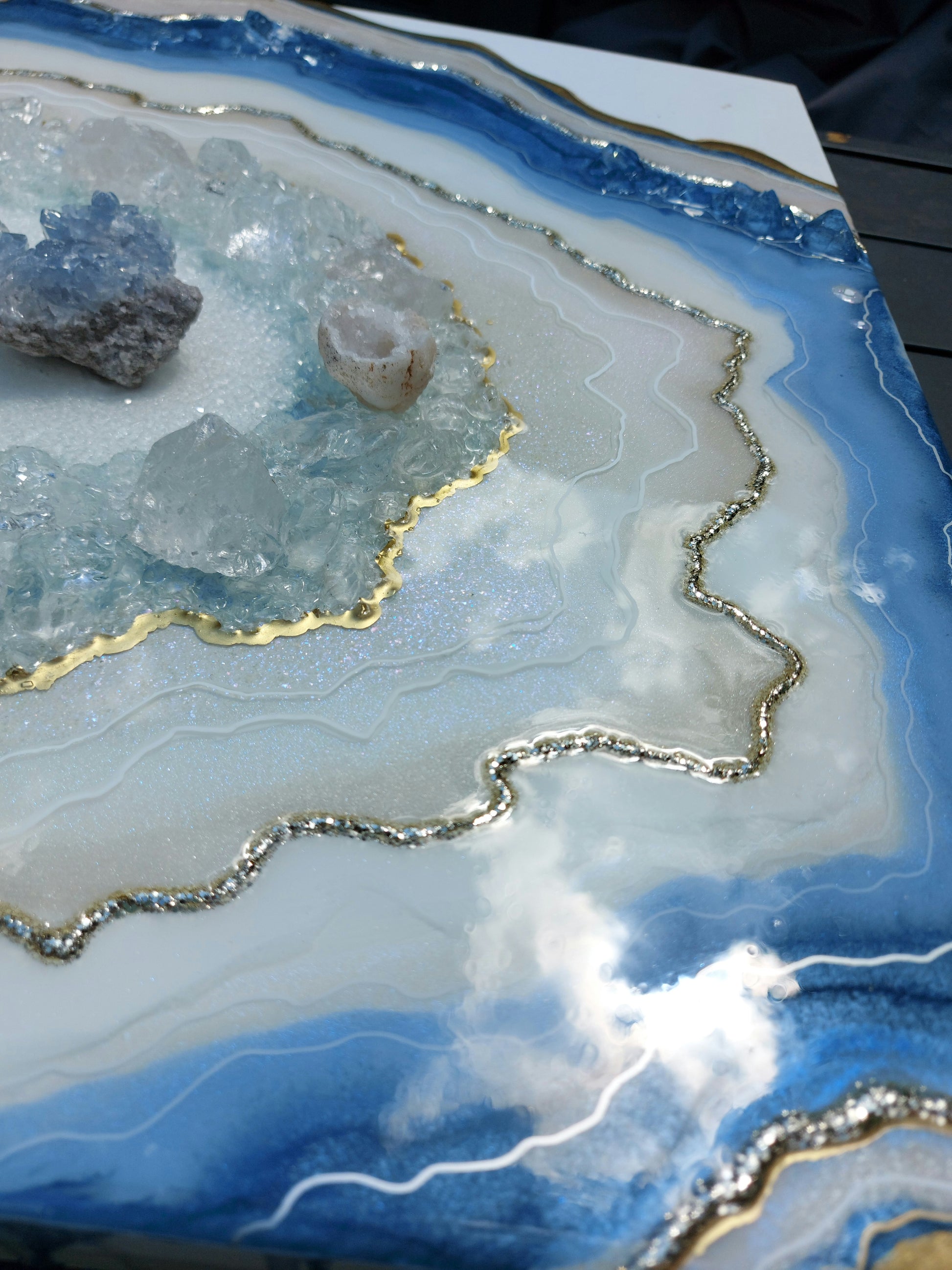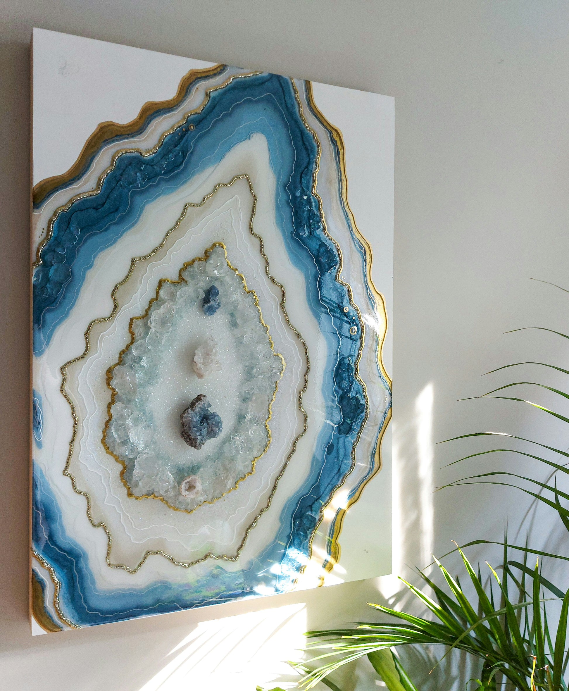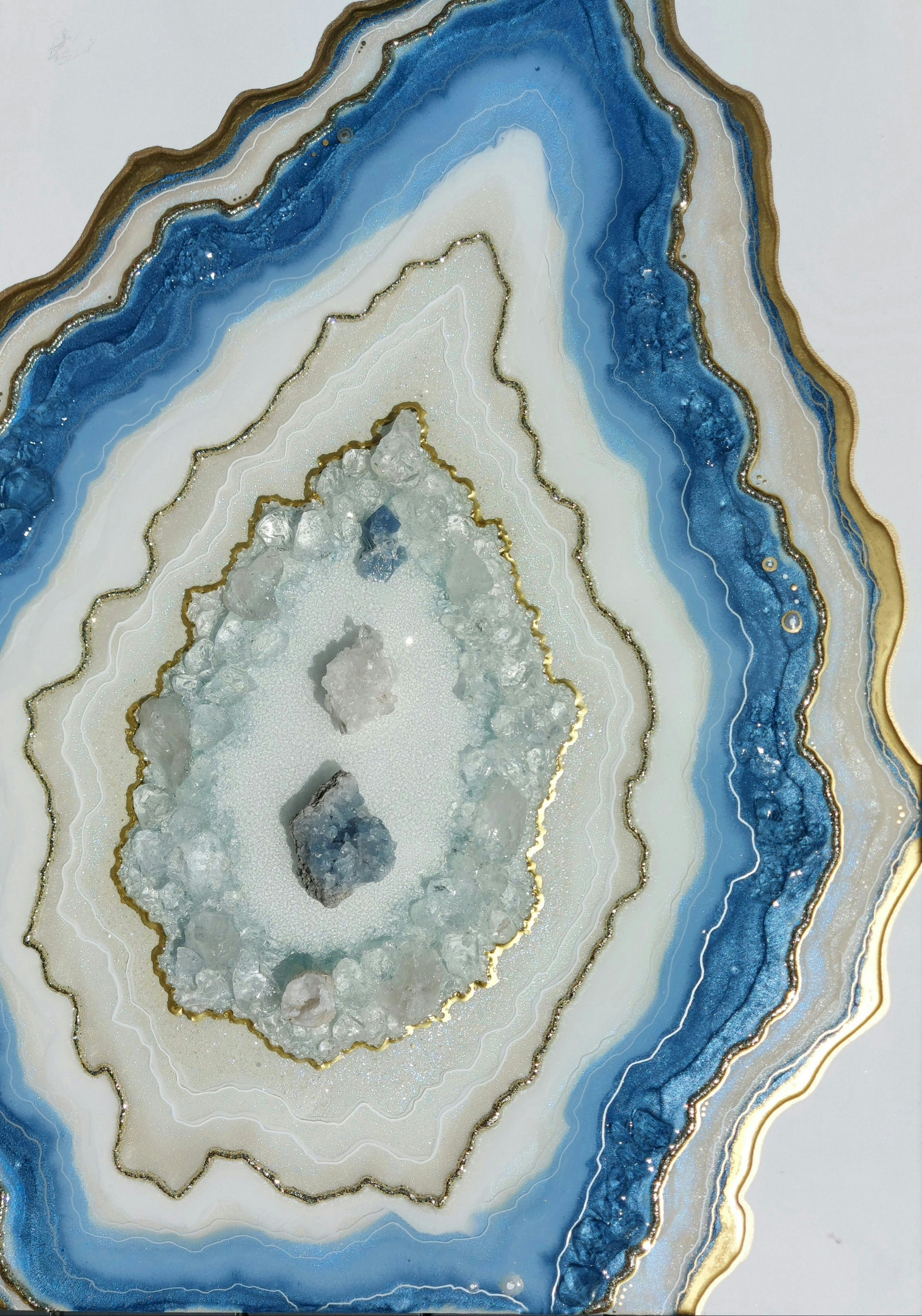 Original Celestite Inspired Geode Artwork - 50x70cm. Clear quartz and celestite infused beautiful piece of art.