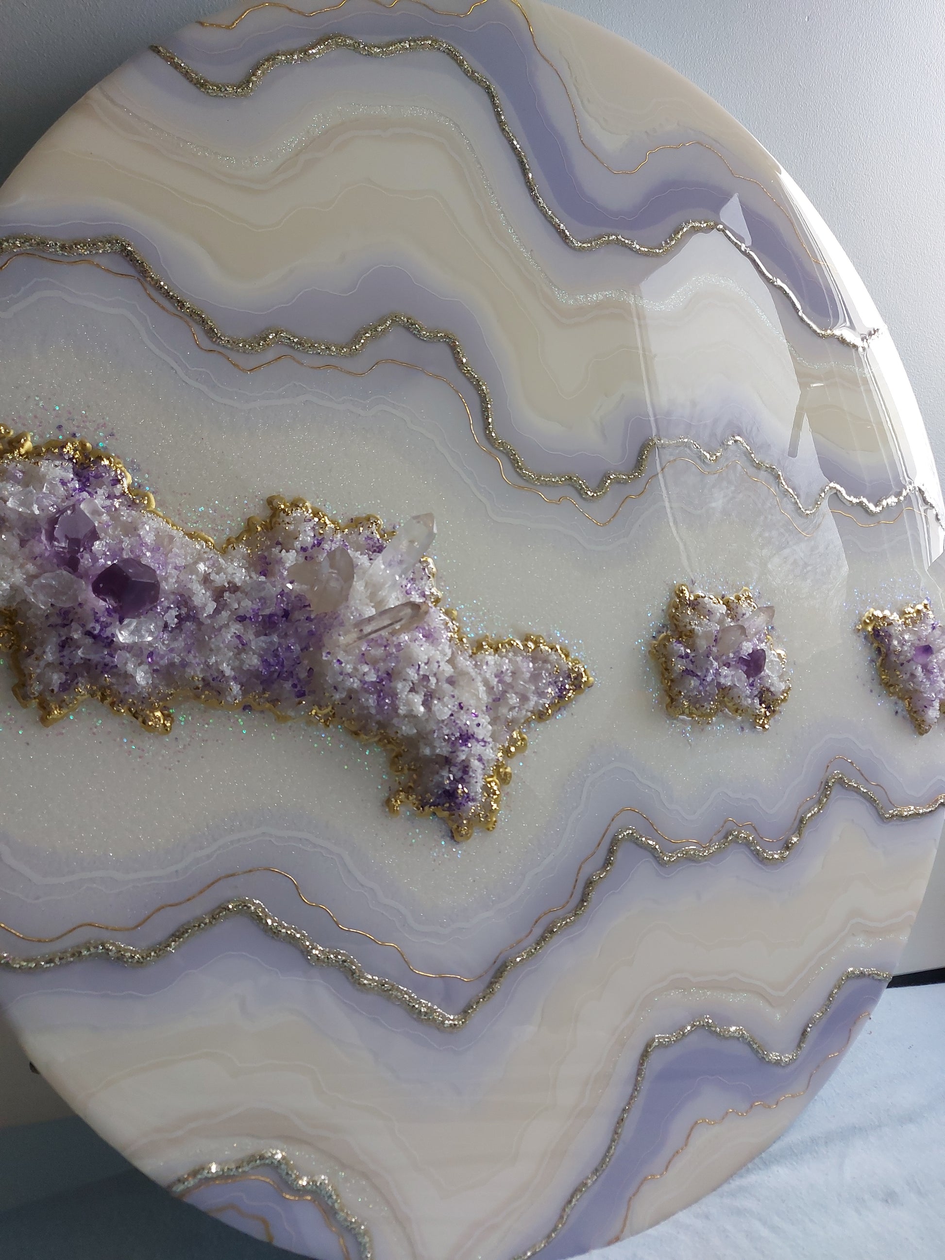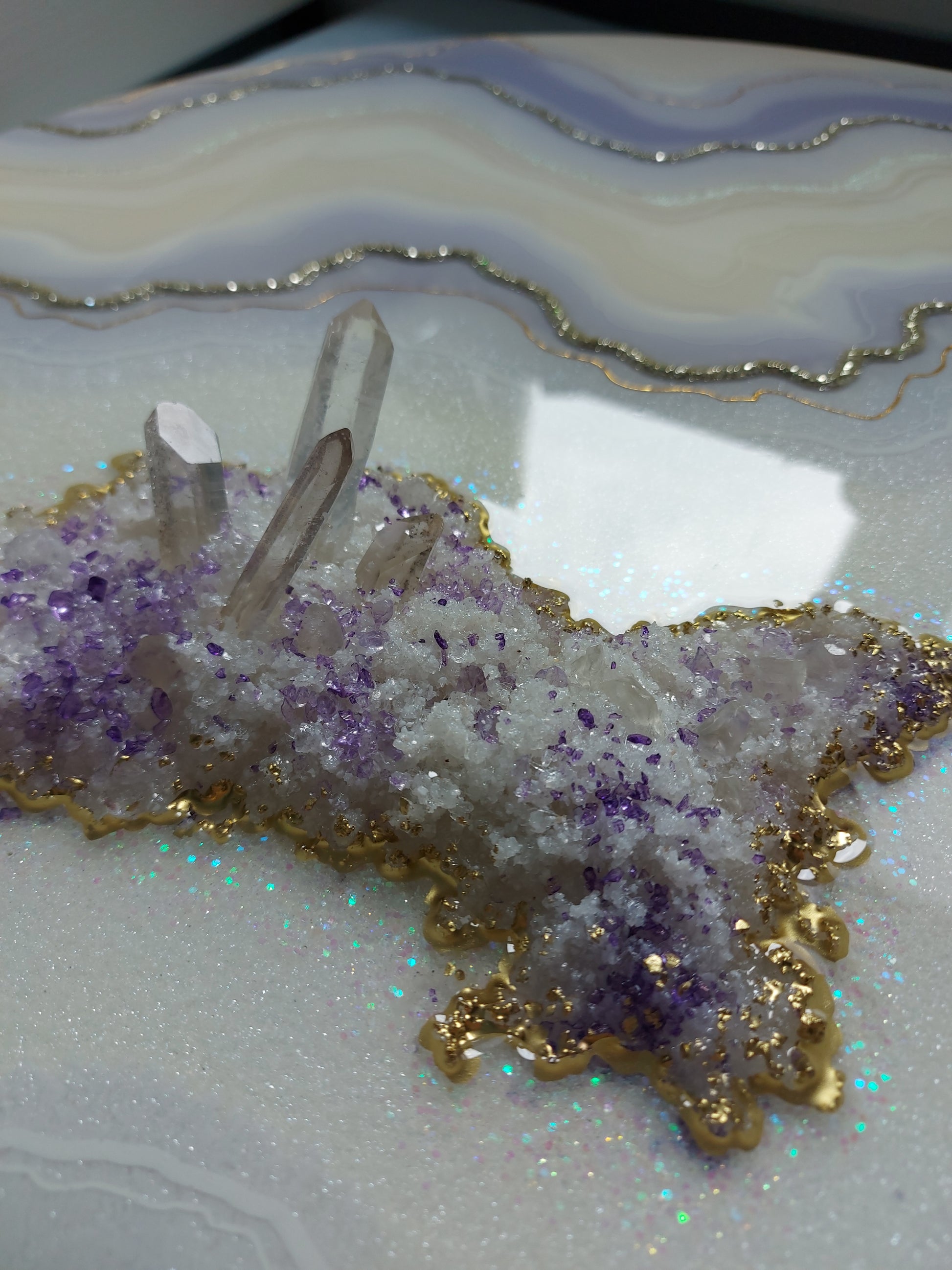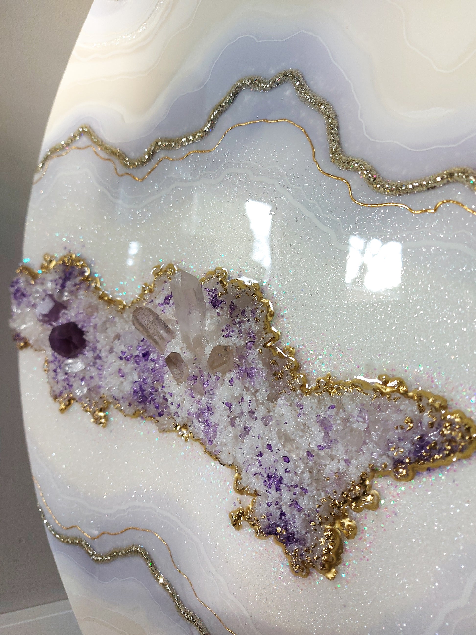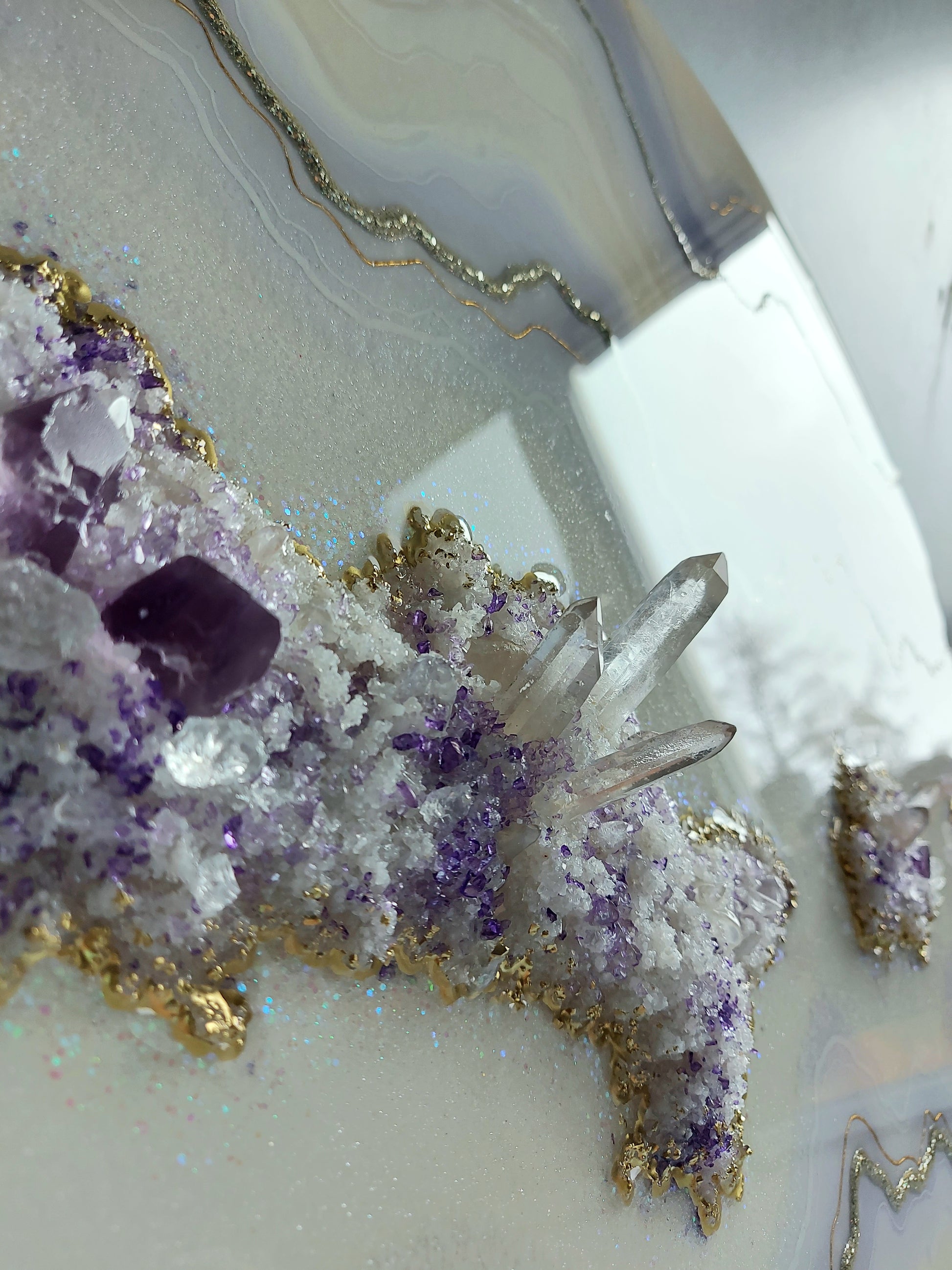 Materials used: high-quality resin and pigments, clear quartz and amethyst, glass, and sand on the professional art wood panel