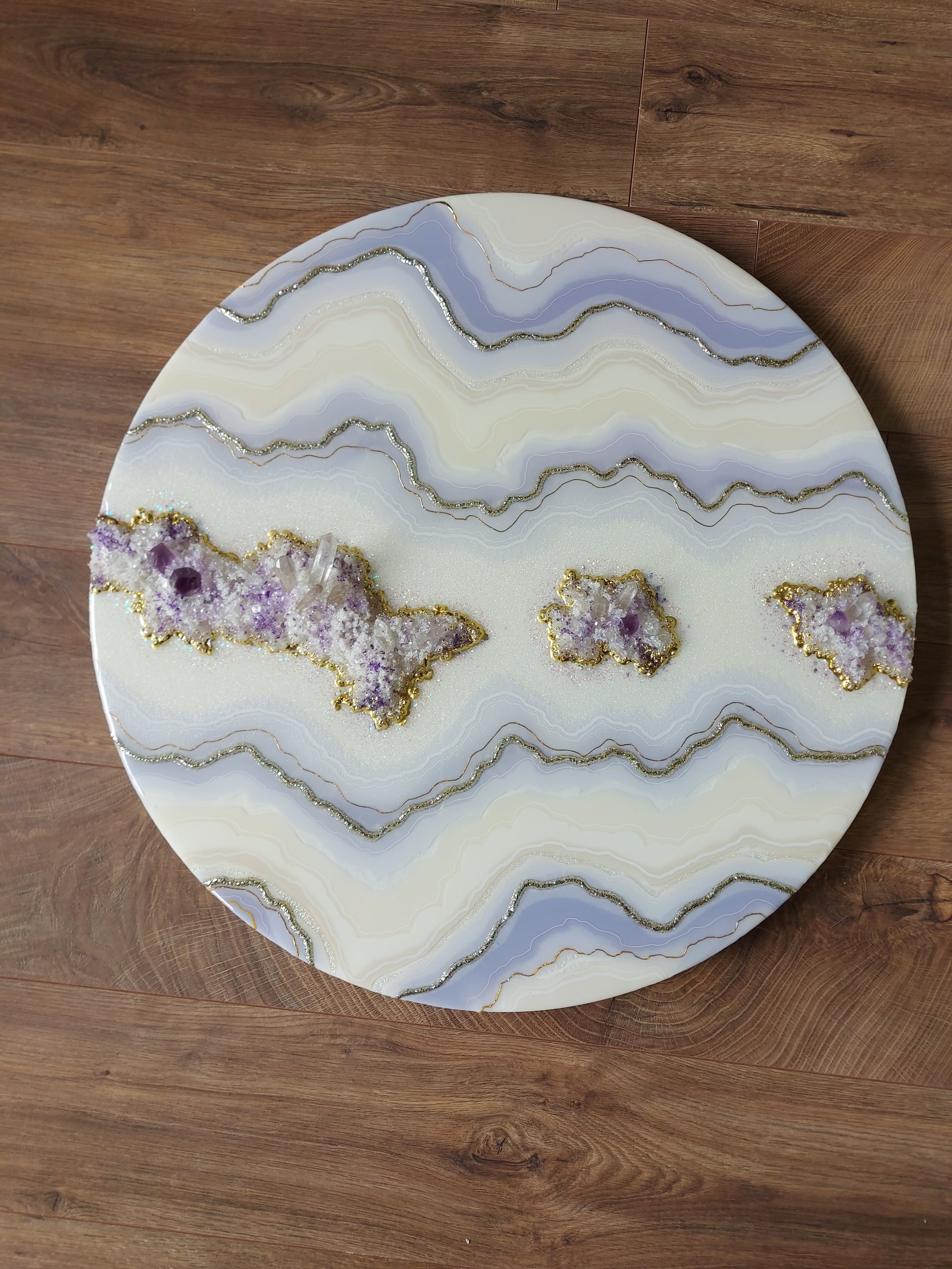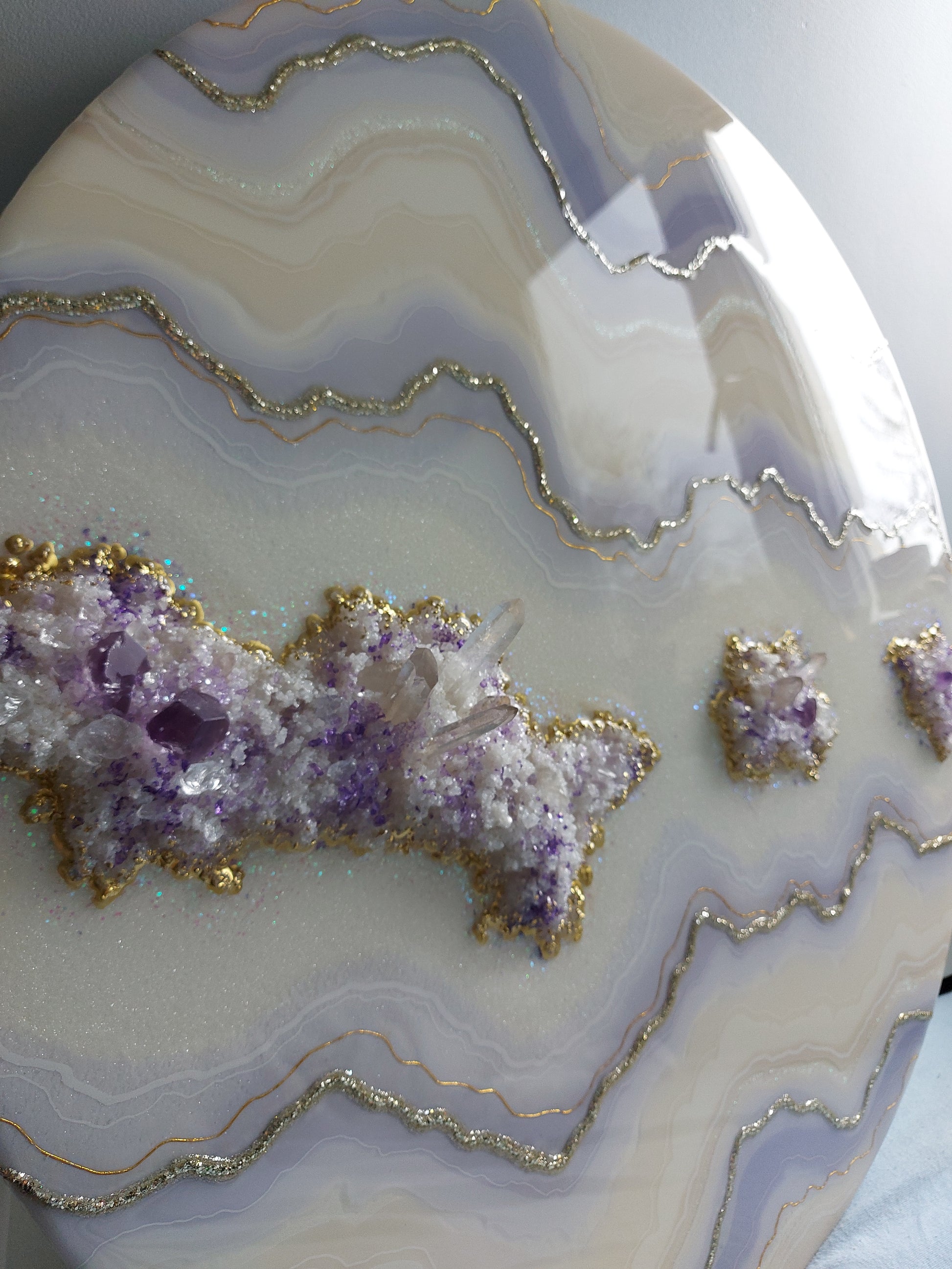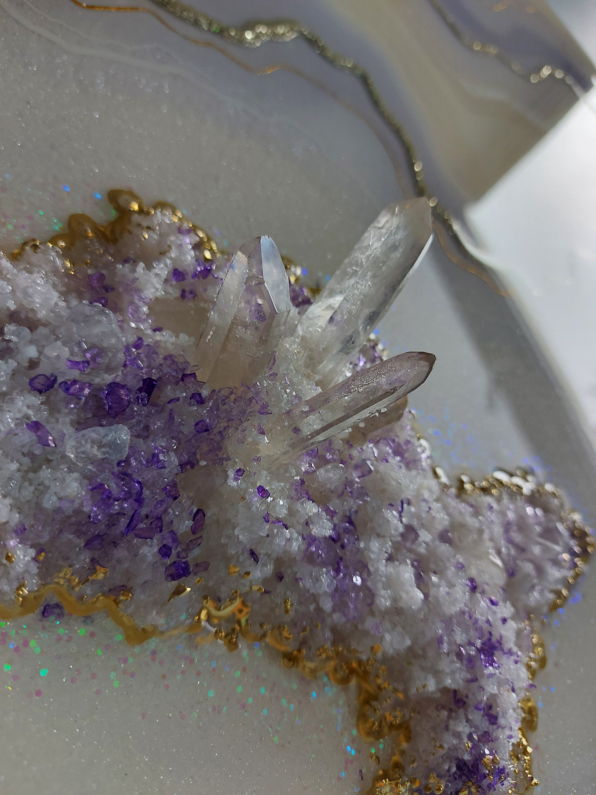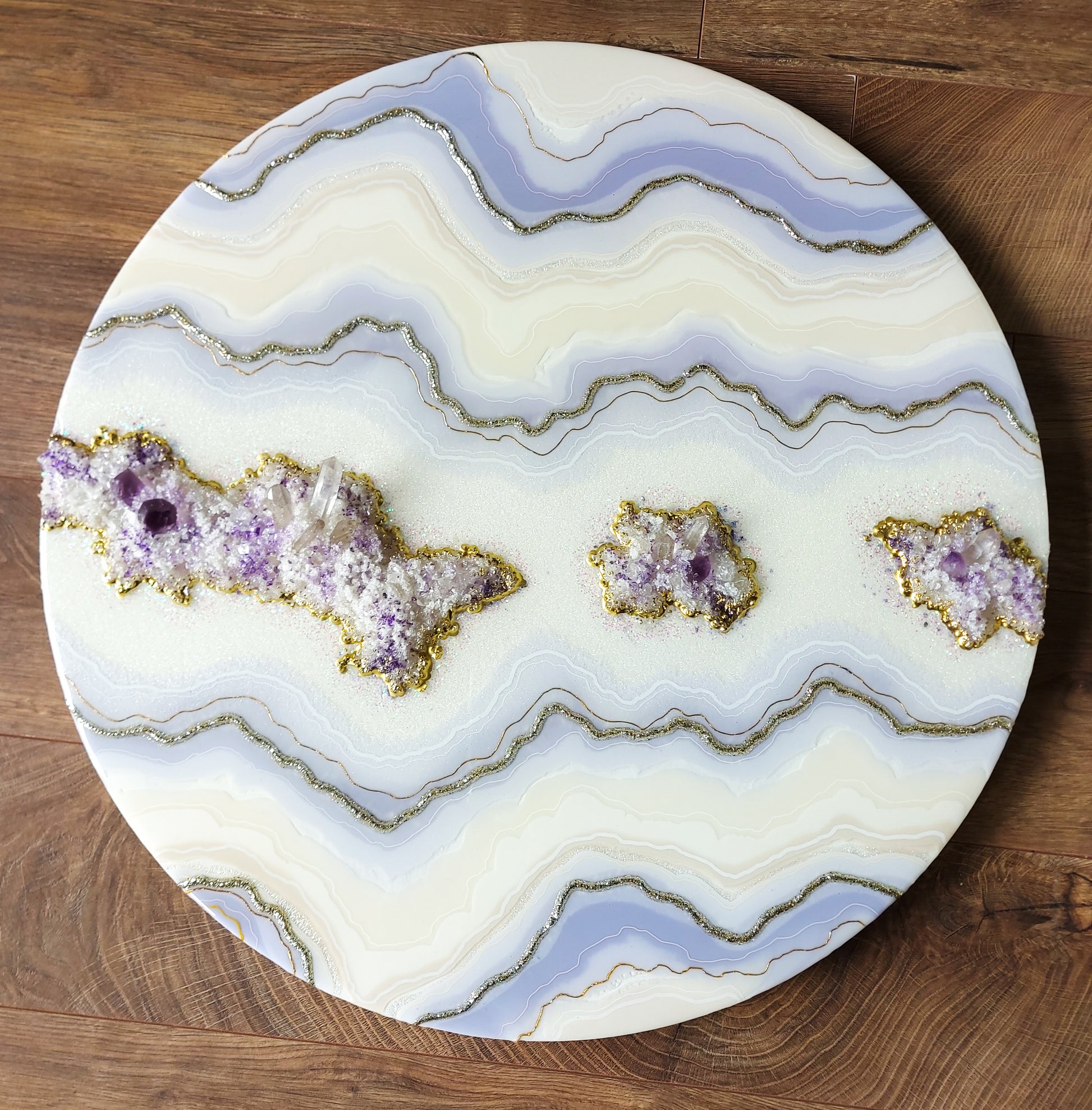 Materials used: high-quality resin and pigments, clear quartz and amethyst, glass, and sand on the professional art wood panel