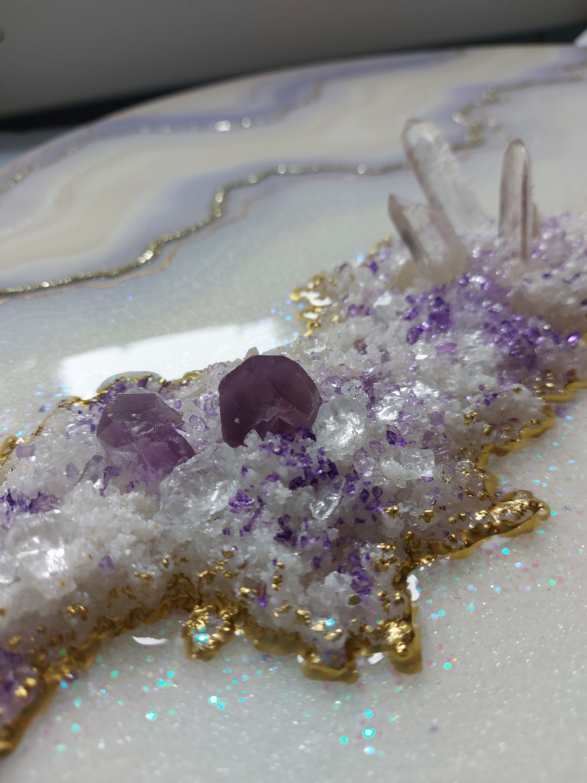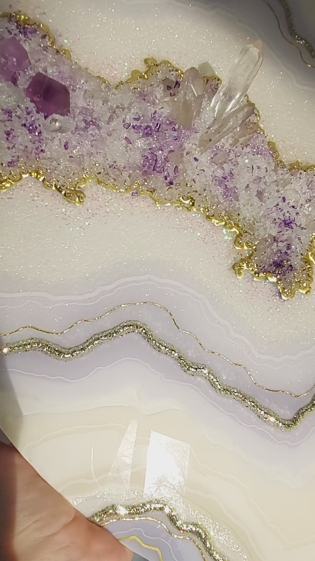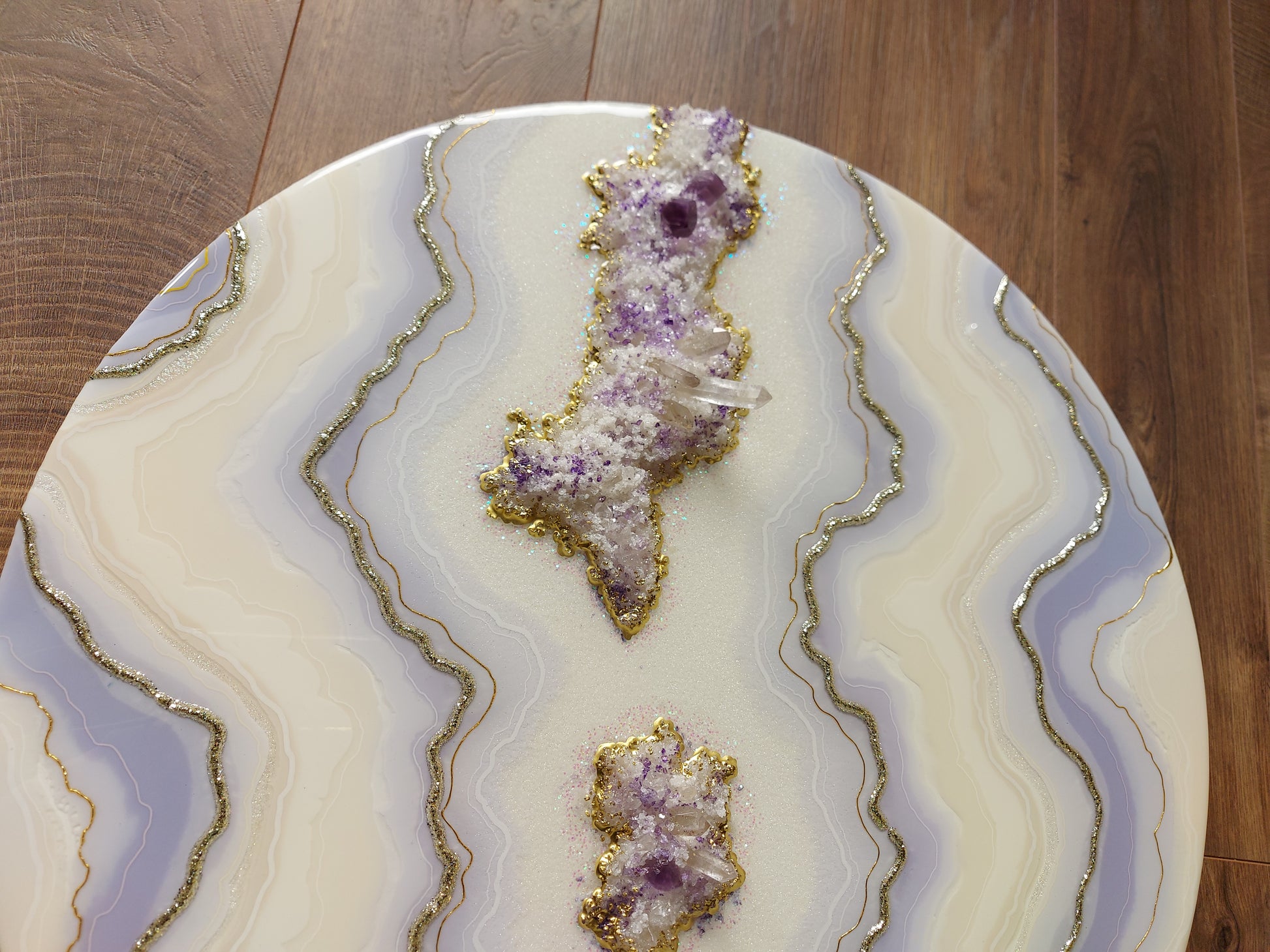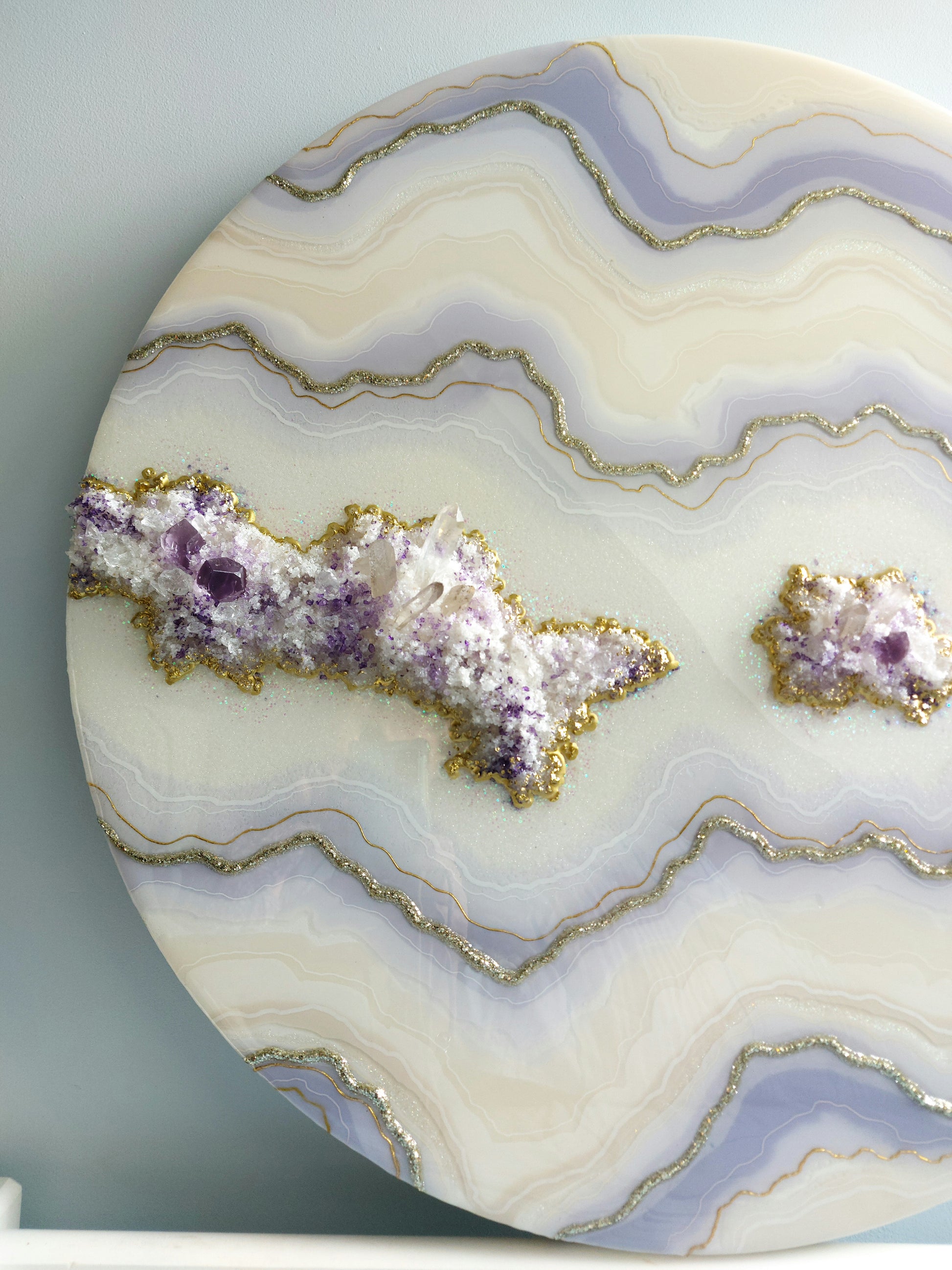 Materials used: high-quality resin and pigments, clear quartz and amethyst, glass, and sand on the professional art wood panel