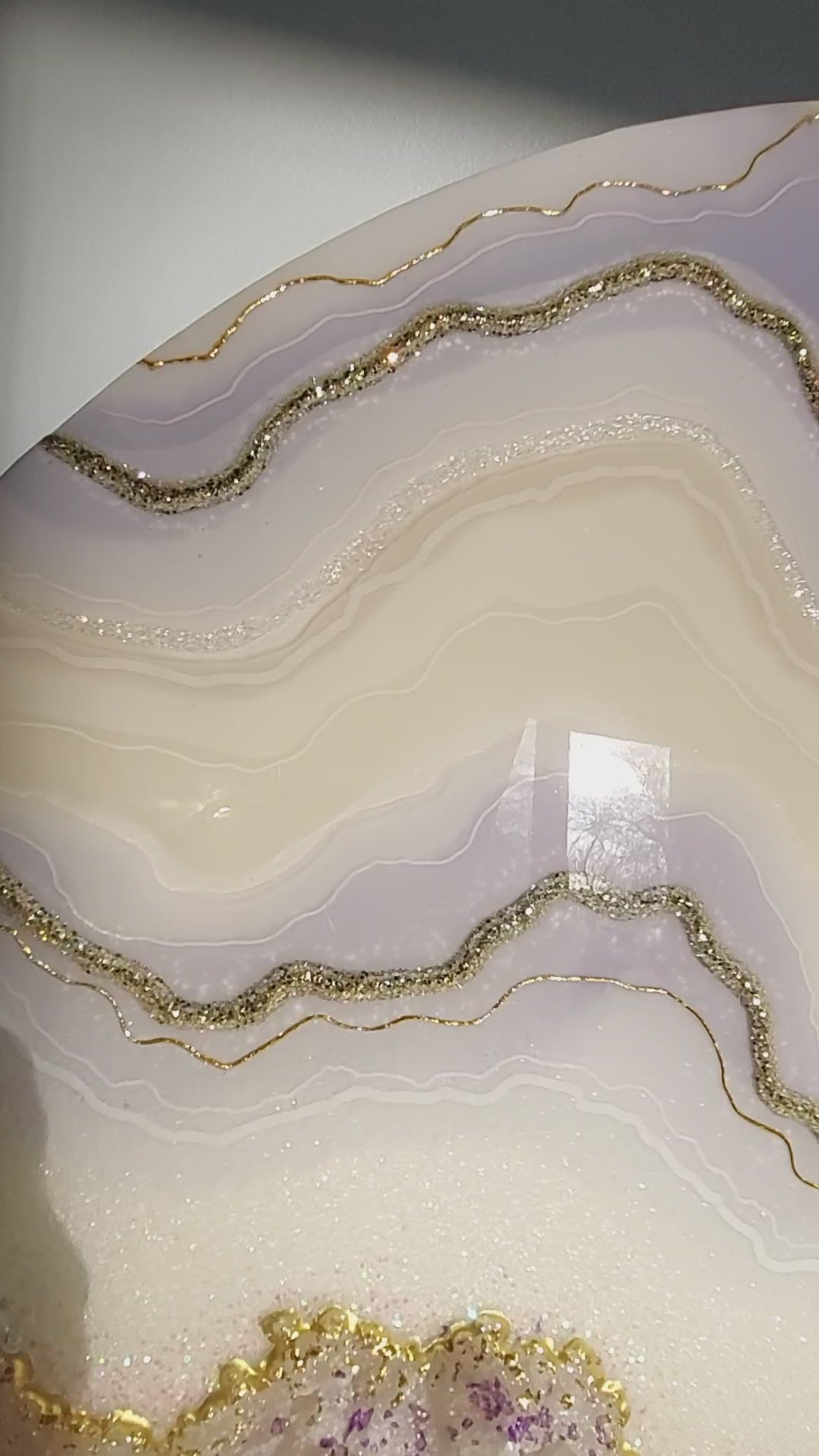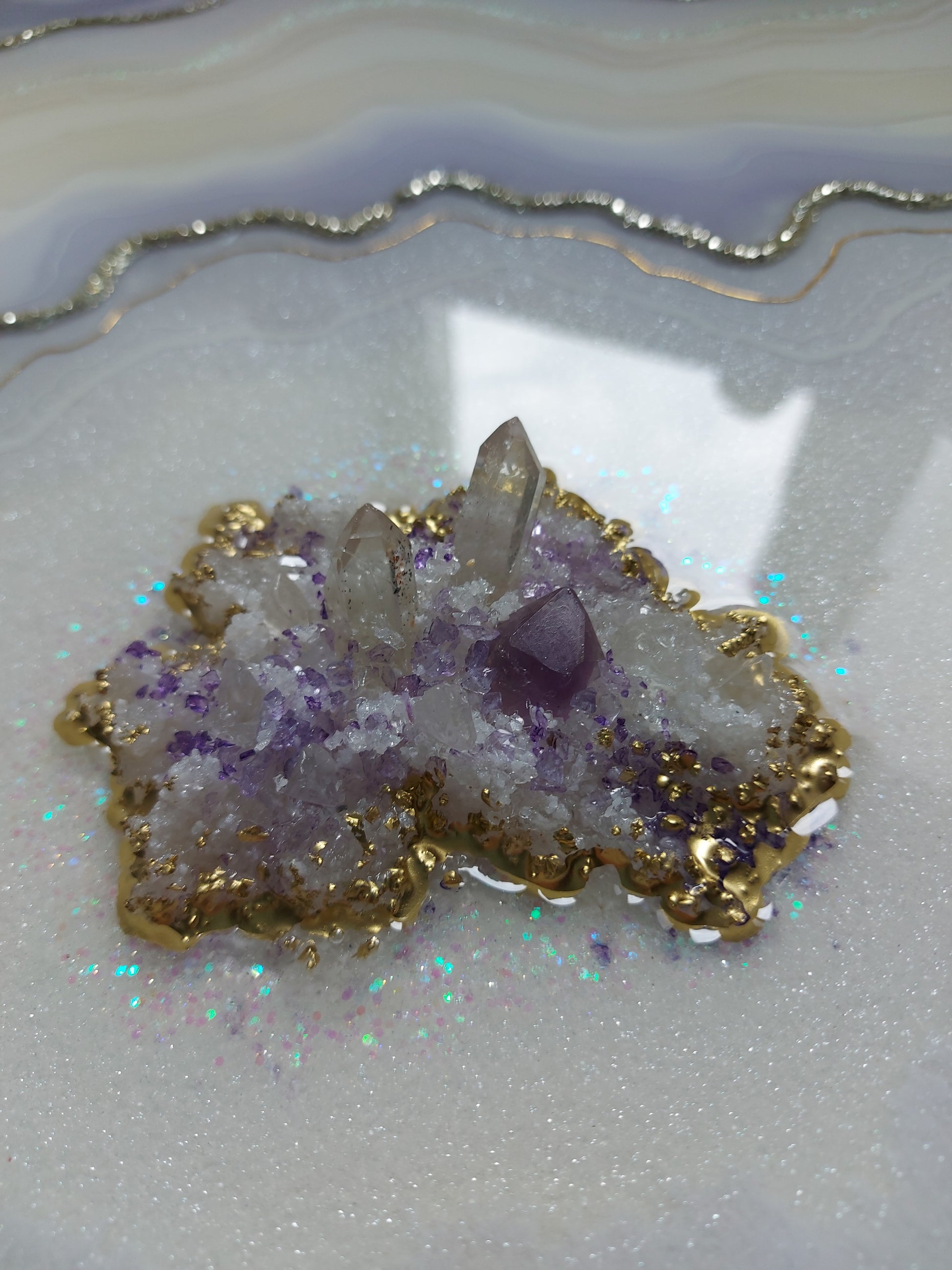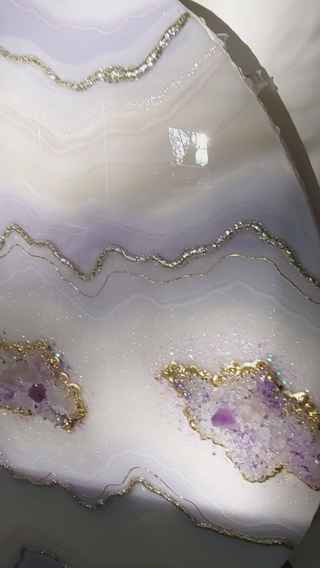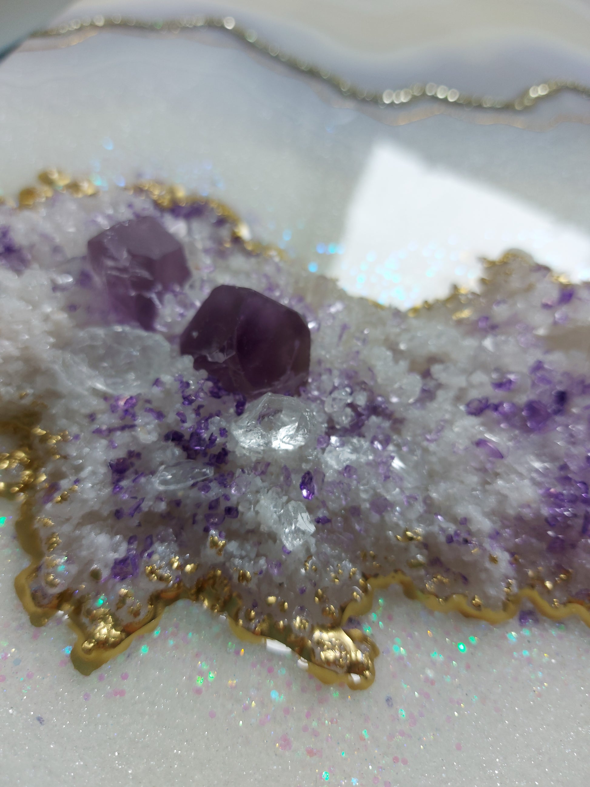 Materials used: high-quality resin and pigments, clear quartz and amethyst, glass, and sand on the professional art wood panel
