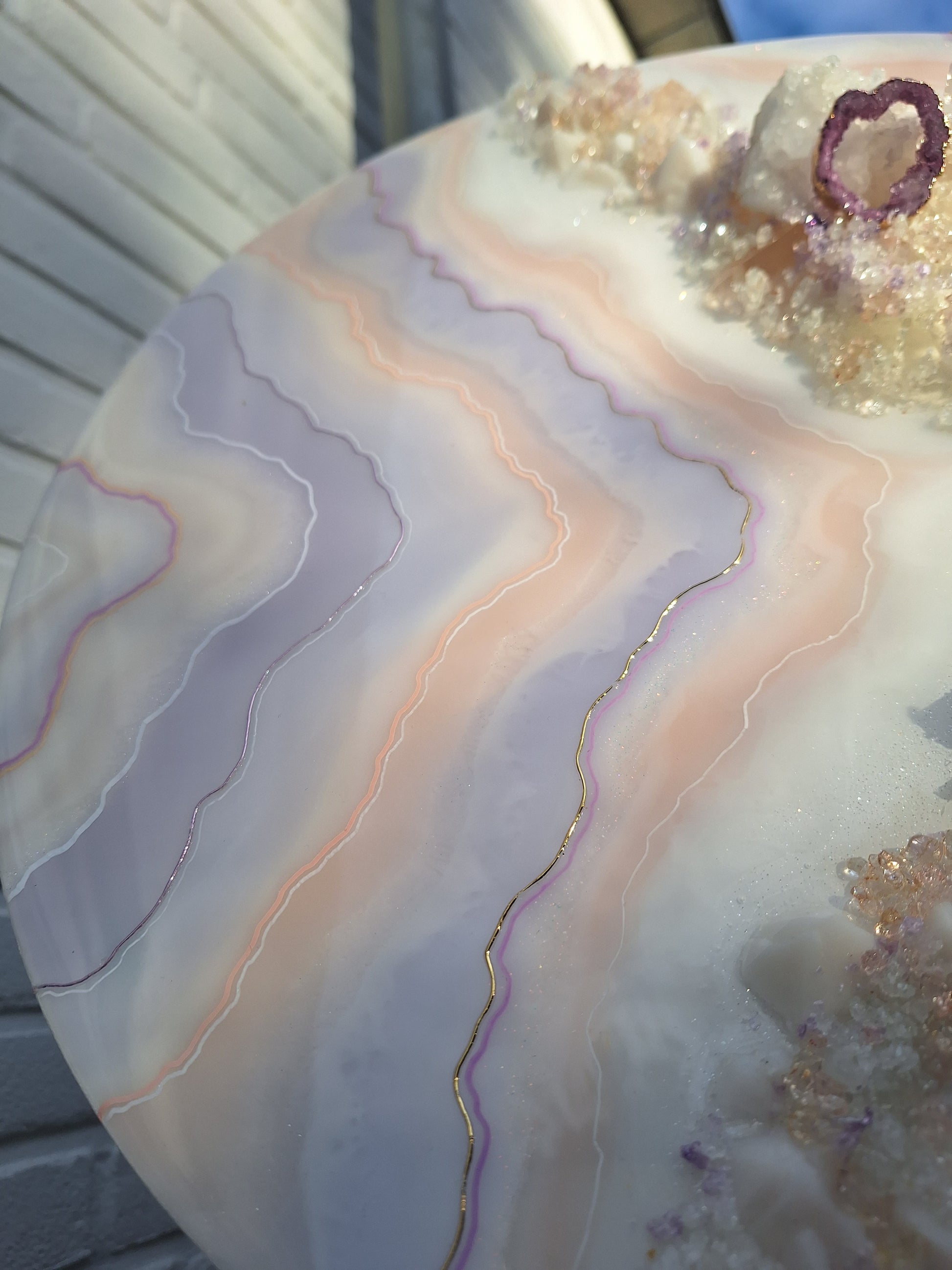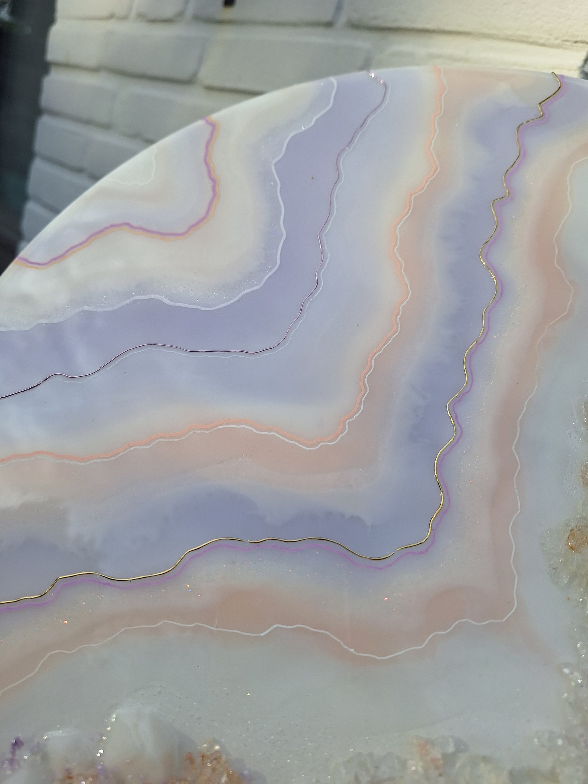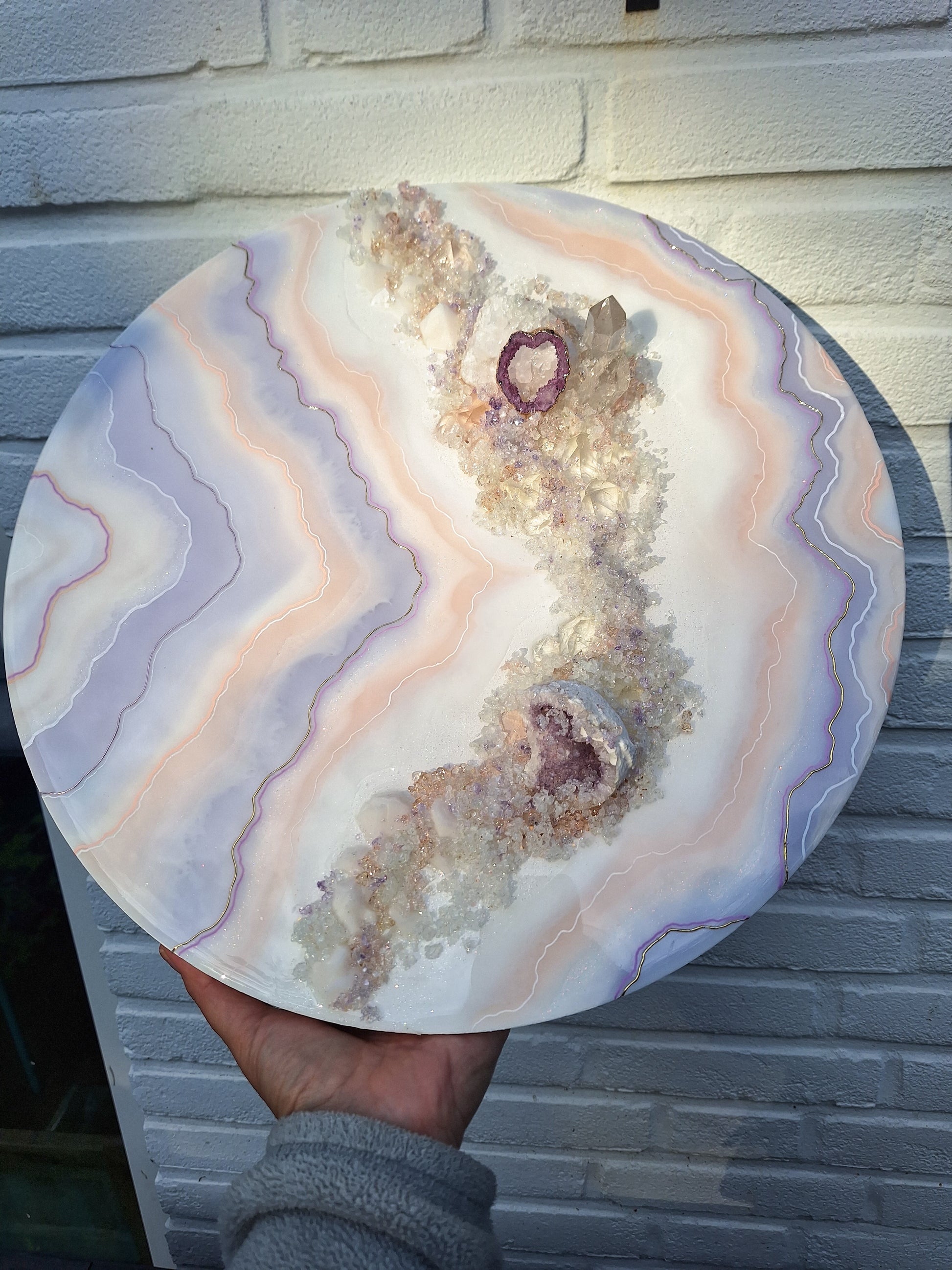 Step into a realm of tranquility and transformation with Whispers of Grace, a breathtaking tribute to the quiet strength woven into nature’s delicate formations. This enchanting 40 cm (14 inch) geode-style painting draws inspiration from the timeless beauty of lace agate, capturing the ethereal dance of healing and renewal. Imagine the gentle hues of purple, salmon pink, and cold beige flowing together like a serene river, inviting you to pause and reflect in its soothing embrace.