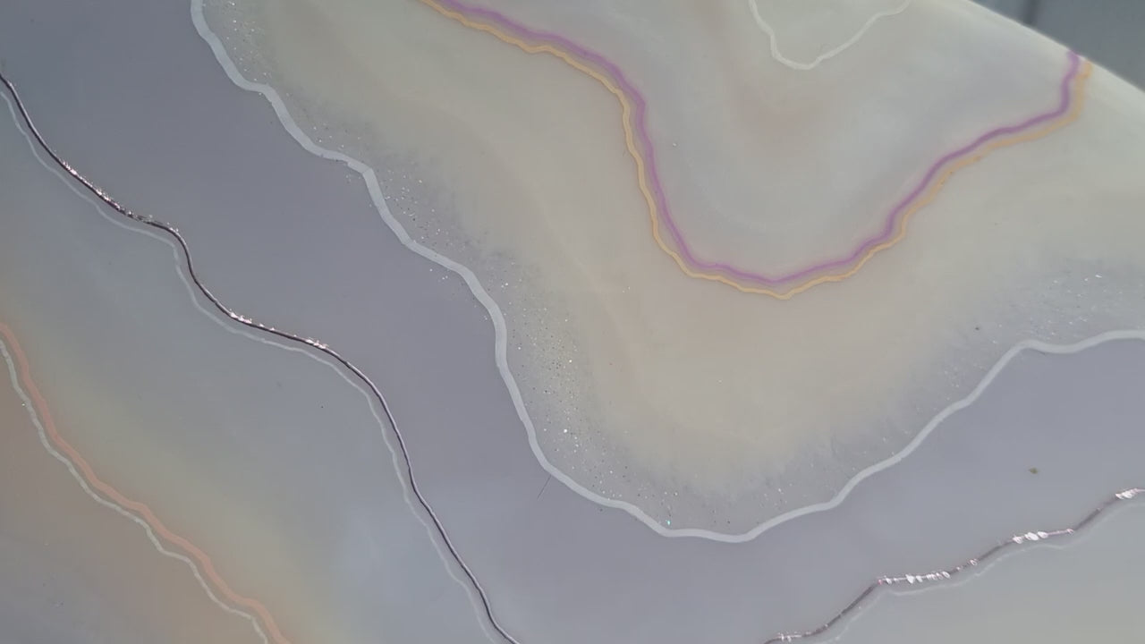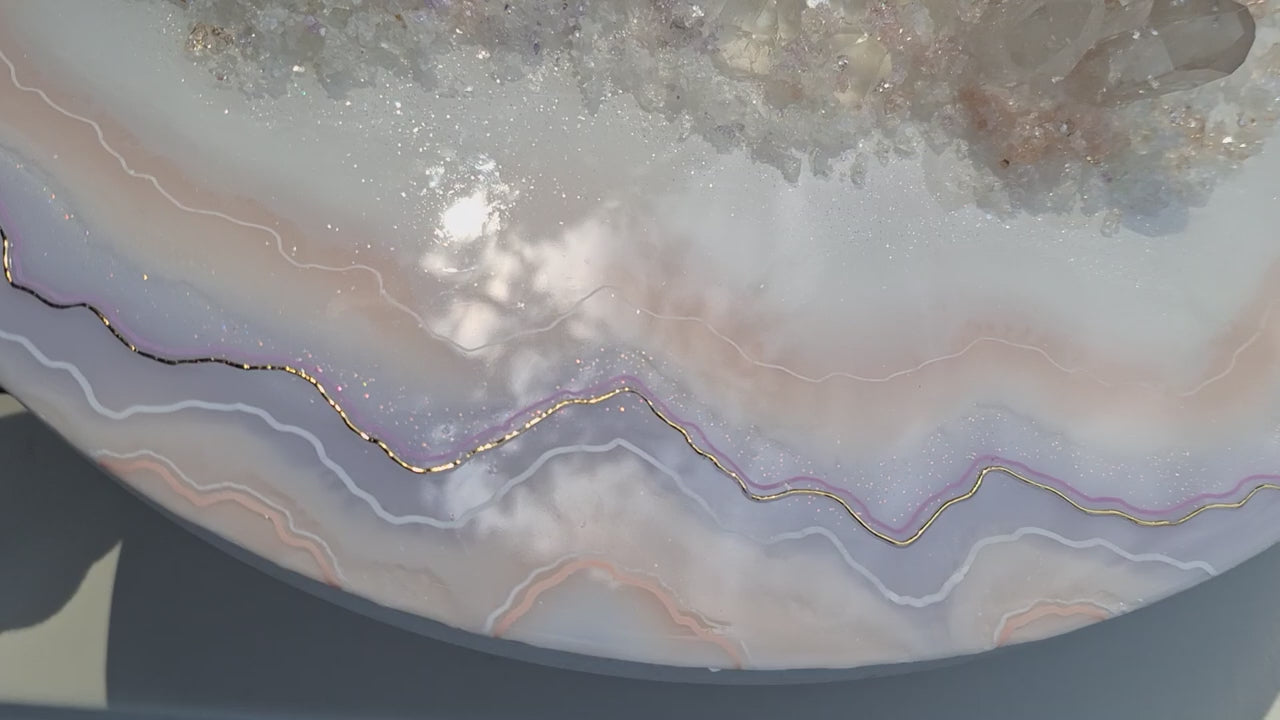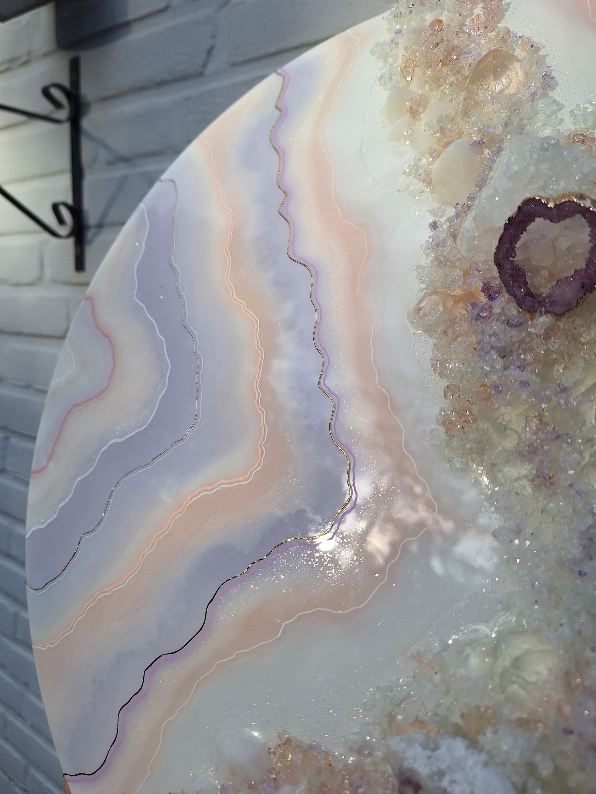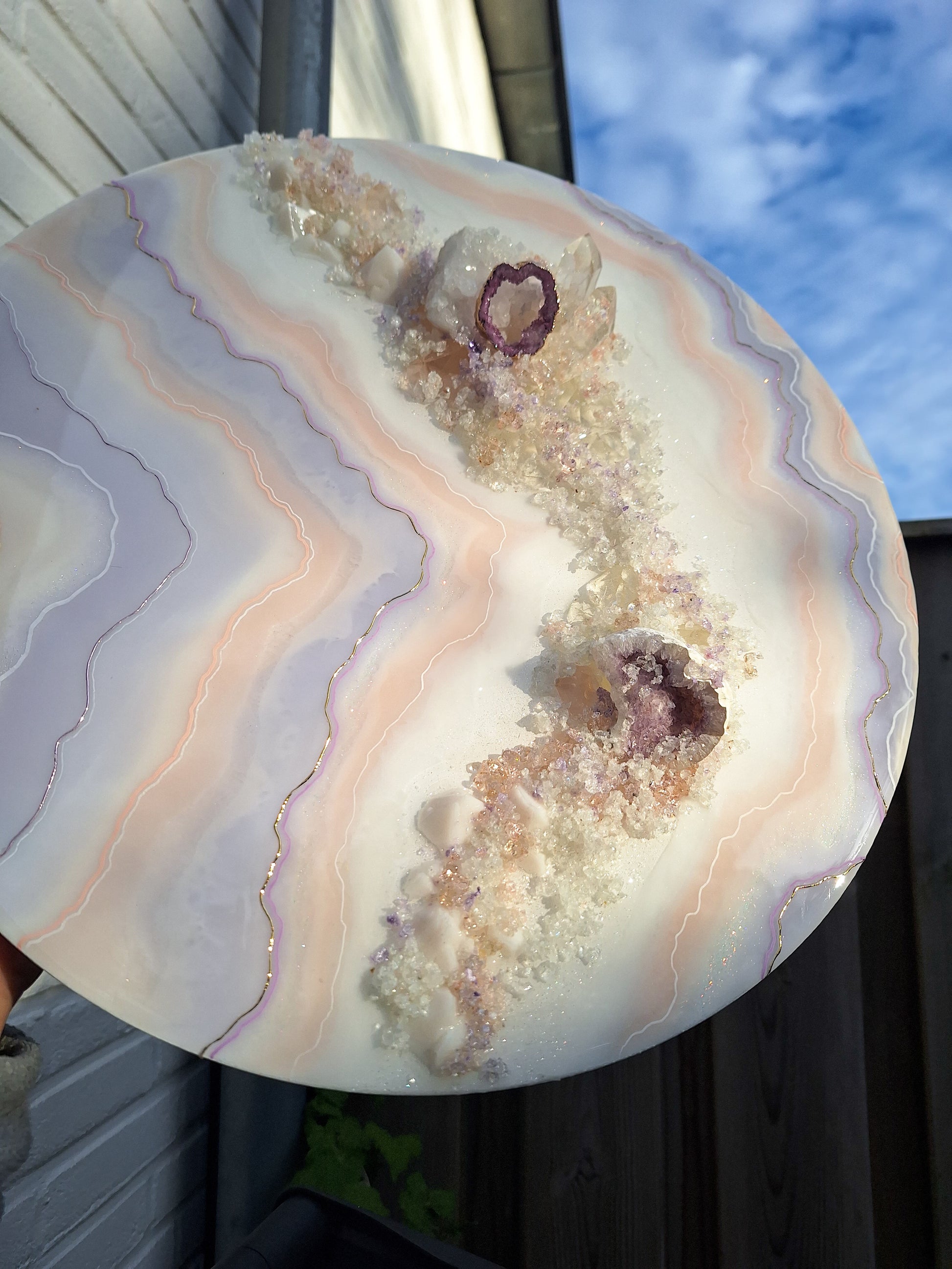 Step into a realm of tranquility and transformation with Whispers of Grace, a breathtaking tribute to the quiet strength woven into nature’s delicate formations. This enchanting 40 cm (14 inch) geode-style painting draws inspiration from the timeless beauty of lace agate, capturing the ethereal dance of healing and renewal. Imagine the gentle hues of purple, salmon pink, and cold beige flowing together like a serene river, inviting you to pause and reflect in its soothing embrace.