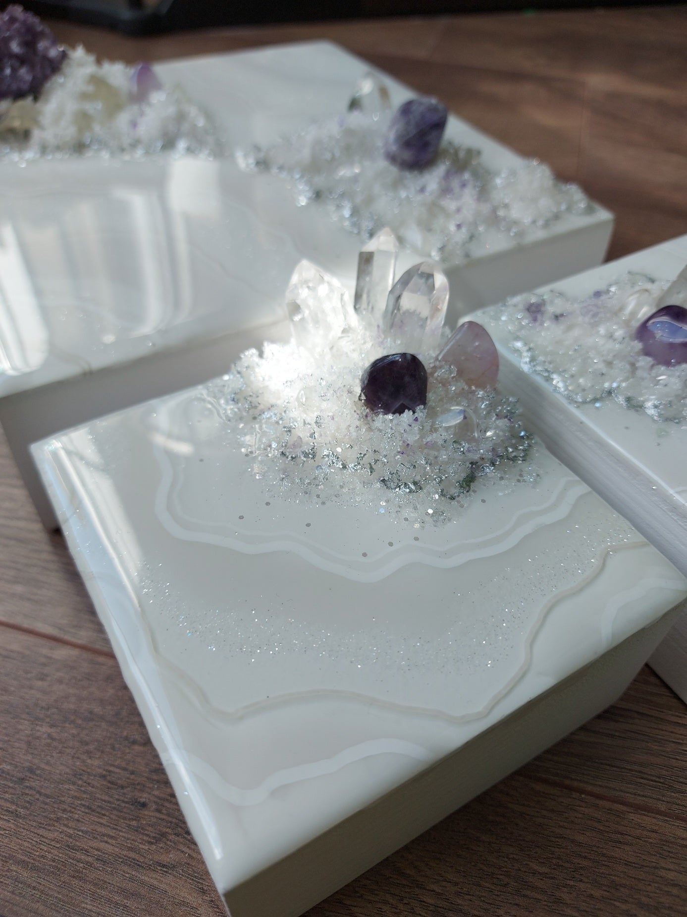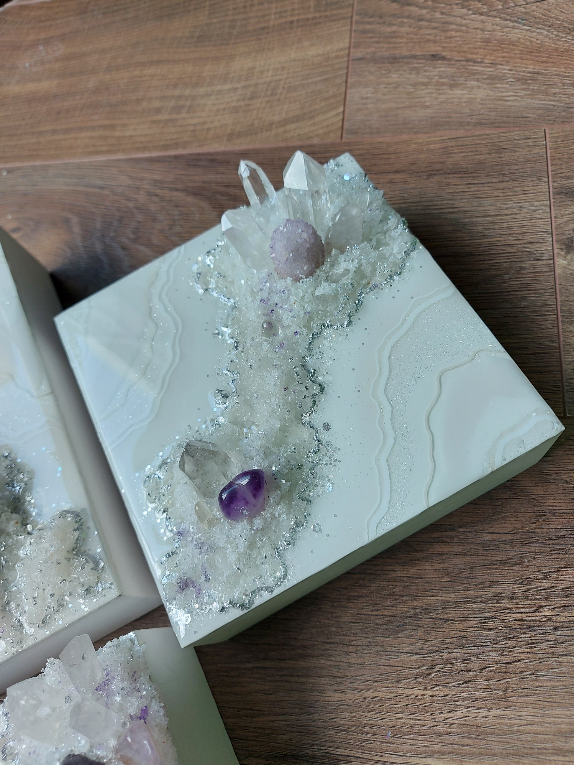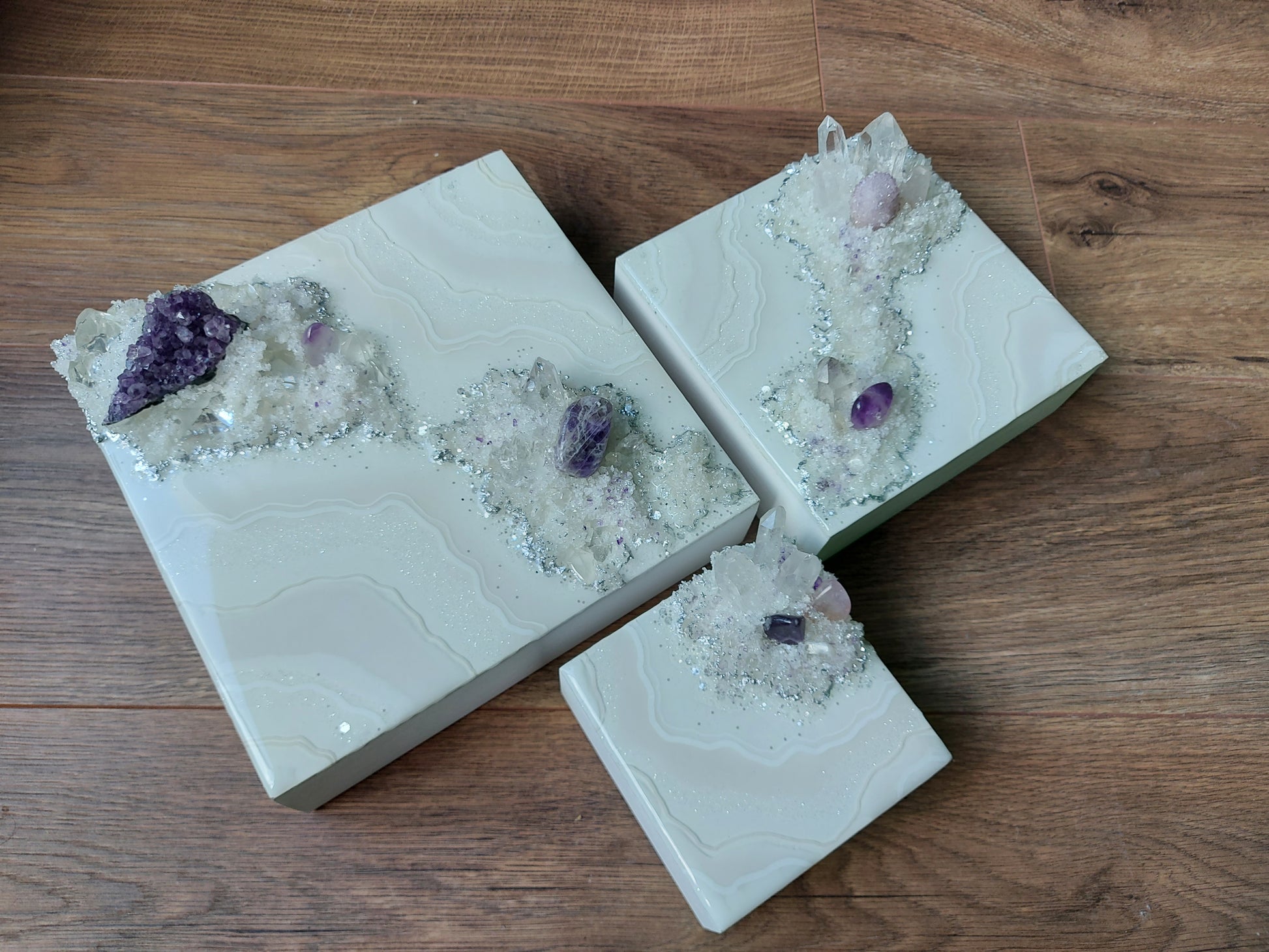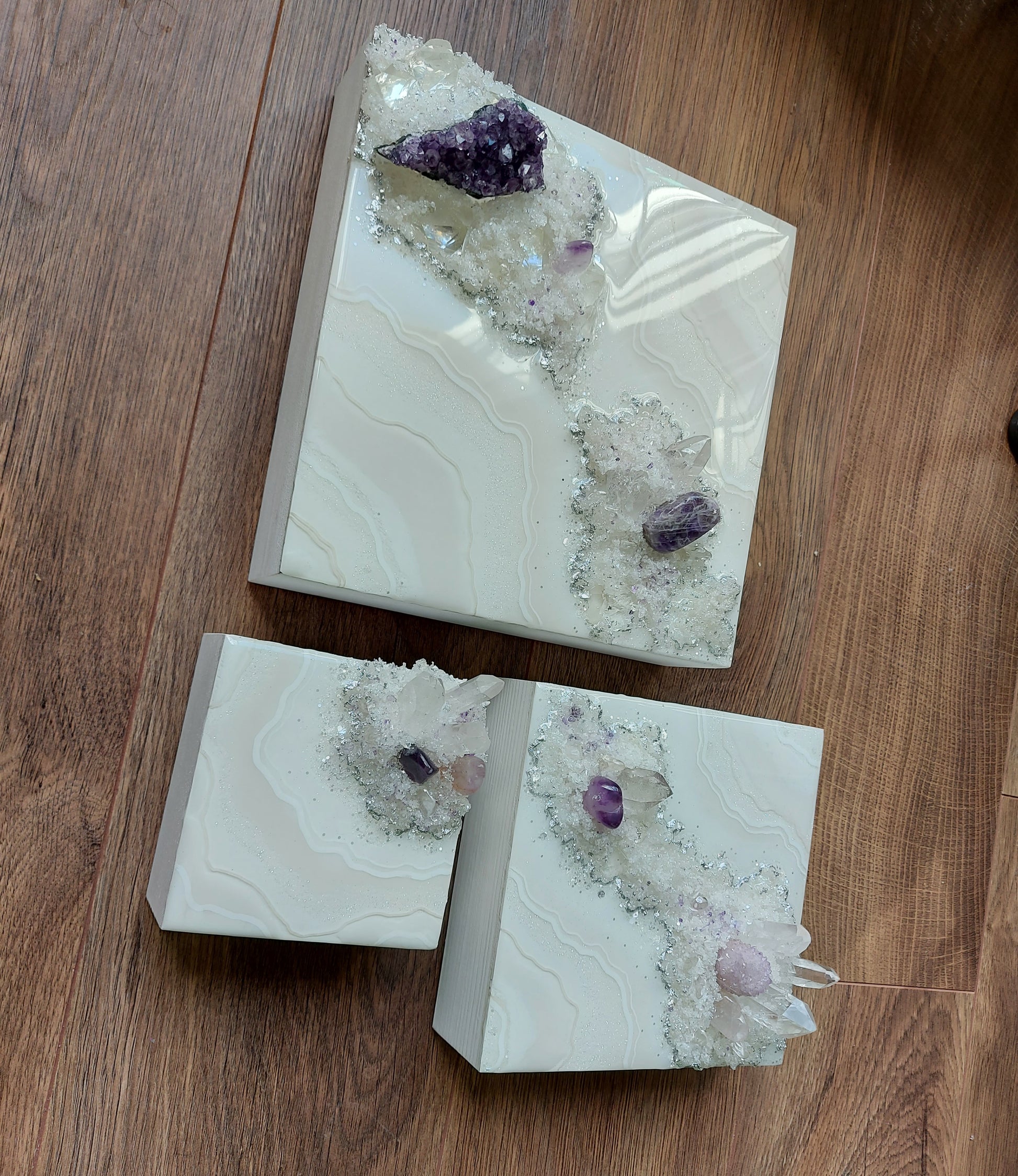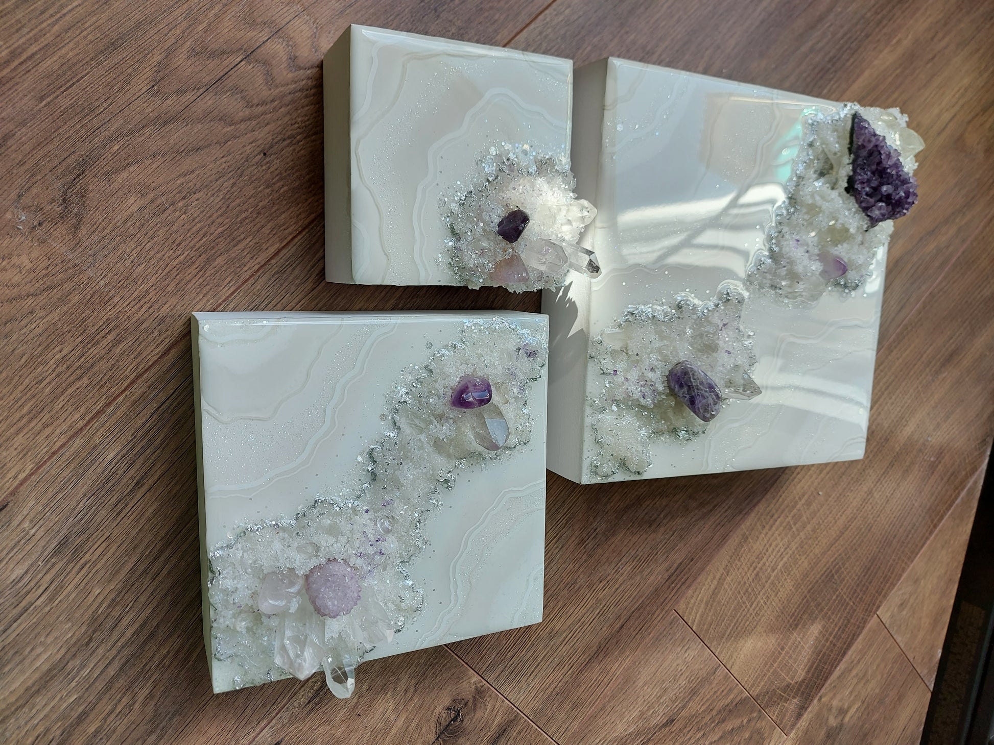 3 Pieces of wall art made with resin and crystals on wooden 5cm (2inch) thick canvas.